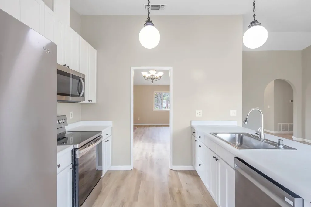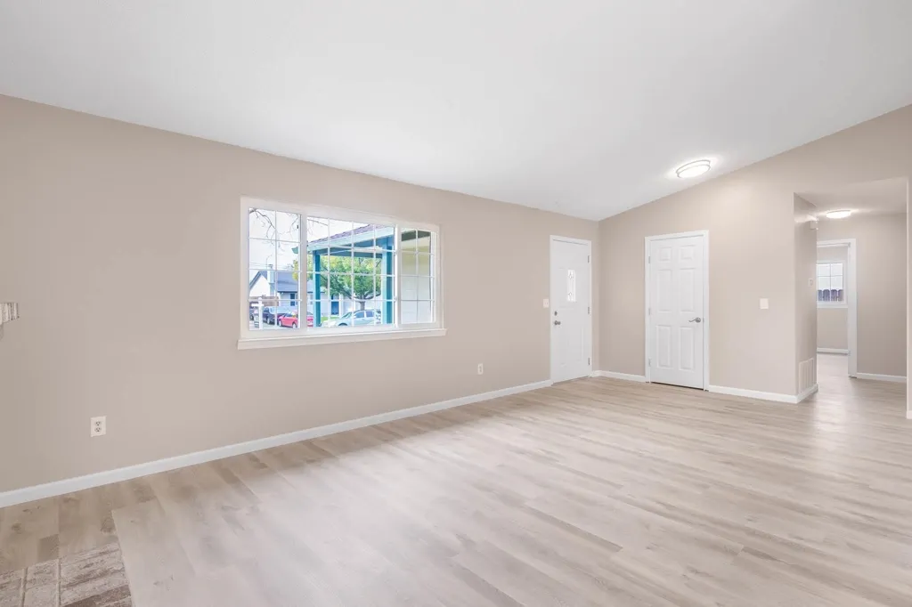 Beautifully situated on a quiet court, this single-level home offers exceptional convenience and a spacious front yard that enhances curb appeal. An expansive driveway provides ample parking with the possibility for RV storage—an increasingly rare find. Inside, the highly sought-after layout features 4 bedrooms and 2 full bathrooms, all on one level. The open floor plan seamlessly connects the family room, living room, and dining area, creating an inviting environment for everyday living and entertaining. Vaulted ceilings and abundant natural light elevate the sense of space throughout. Fresh designer paint adds a modern touch, while brand-new Georges Luxury LVP flooring brings durability and elegance to every room. The bright kitchen showcases white cabinetry paired with stainless-steel appliances for a clean, contemporary look. A top-of-the-line LG washer and dryer are also included for added value. Energy efficiency is built in with a 28-panel solar lease system, helping reduce monthly utility costs. This home combines comfort, style, and practicality in one rare single-story package.