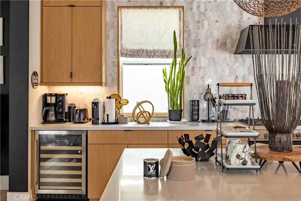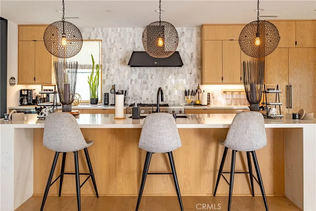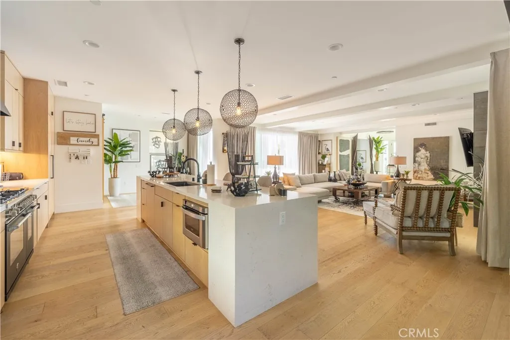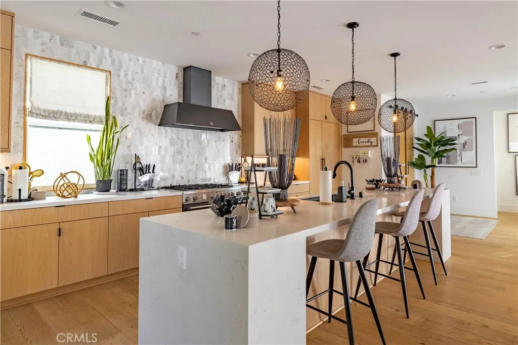 The chef’s kitchen is the centerpiece of the home, showcasing a massive quartz island, modern wood cabinetry, black appliances, and statement accent lighting. It flows seamlessly into the family room and opens to a spacious entertaining patio with hillside views — ideal for indoor-outdoor California living.