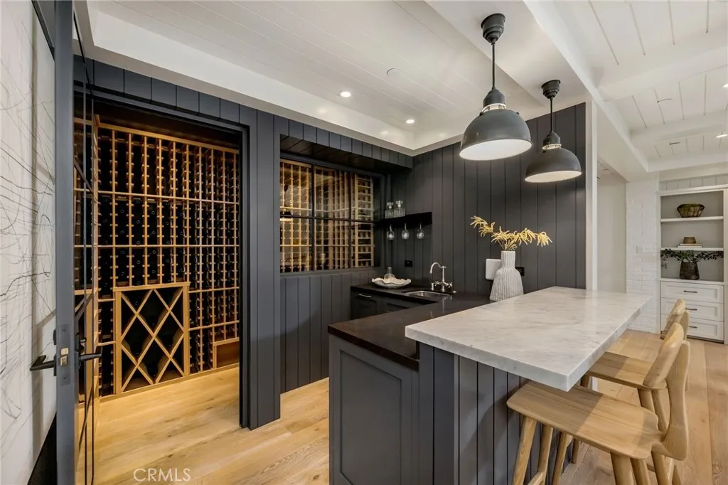 "Sunsets, ocean air, and spaces that flex with your life—this architecturally refined coastal home is designed to live the way Manhattan Beach buyers actually want to live. Set on a southwest corner just moments from the Strand, the home unfolds across four thoughtfully designed levels, each offering its own mood—from relaxed entertaining to quiet retreat. Wide-plank French oak floors, warm wood paneling, and metal-framed windows create a calm, elevated backdrop that feels both modern and timeless. The top level is where life naturally gathers. Walls of glass and bi-fold doors open to a panoramic ocean-view deck—perfect for sunset dinners, weekend barbecues, and evenings that stretch just a little longer with a glass of wine in hand. A chef’s kitchen anchors the space, outfitted with Sub-Zero and Wolf appliances, slab marble counters, and a breakfast bar that keeps everyone connected to the view. Below, the home reveals its most unexpected feature: a lower-level lounge that feels nothing like a basement. By excavating the west side yard, the space is flooded with natural light and generous proportions. Designed as a sophisticated entertainment retreat, it features a custom bar, temperature-controlled wine cellar, and lounge seating—yet easily transforms into a private guest suite or secondary living space, complete with a Murphy bed, bath, laundry, and elevator access. The bedroom levels offer privacy and flexibility, including a serene primary suite with its own ocean-view deck, spa-like marble bath, and adjacent room that can serve as an office, study, or nursery. A separate-entry bedroom suite on the garage level adds ideal functionality for guests, work-from-home, or extended stays. A four stop elevator, Smart-home technology, secure steel entry, whole-house water filtration, and a Tesla Powerwall system quietly support the lifestyle—letting the home feel effortless, intentional, and ready for everyday living by the coast. This is not just a home near the ocean—it’s a home built around the way you experience it."