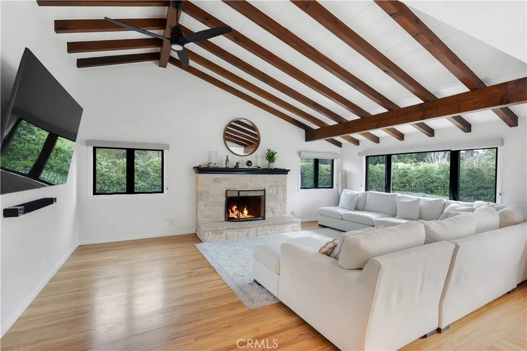 PRICE IMPROVEMENT!! A Rare Opportunity You Won't Want to Miss! Welcome to an exceptional residence nestled in one of Woodland Hills’ most coveted neighborhoods where refined design, complete privacy, and resort-style living converge effortlessly. Concealed behind mature hedges and a private electric gate, this beautifully reimagined single-story estate offers four bedrooms, three bathrooms, and over $200,000 in curated upgrades. From the moment you enter, rich hardwood floors, soaring vaulted beamed ceilings, and abundant natural light create an atmosphere that is both warm and architecturally striking. At the heart of the home lies a spectacular chef’s kitchen, thoughtfully redesigned for both elegance and function. Outfitted with quartz countertops, an expansive center island, stainless-steel appliances, dual wine refrigerators, and a generous walk-in pantry, this culinary space seamlessly serves everyday living and elevated entertaining. Skylights brighten the breakfast area, while the formal dining room provides the perfect backdrop for intimate dinners and festive gatherings alike. The grand living room is equally impressive, showcasing dramatic vaulted ceilings and a statement fireplace that anchors the space with character and comfort. The primary suite serves as a private sanctuary, complete with vaulted ceilings, its own fireplace, beautiful walk-in closet and a spa-inspired bath adorned with marble countertops, a jetted soaking tub, and a glass-enclosed shower. French doors throughout the home invite you into a truly extraordinary backyard retreat. Designed for year round enjoyment, the outdoor oasis features a newly built Olympic style saltwater pool and spa, tranquil fountain, mature fruit trees, and lush landscaping. A fully equipped outdoor living room with built-in BBQ, smoker, and kitchen creates the ultimate setting for entertaining under the California sky. Modern conveniences further elevate the property, including fully paid solar panels, EV charger, two-zone HVAC, security system with cameras, WiFi-enabled smart home features, hardwired televisions, brand new plumbing, offering efficiency, comfort, and peace of mind. Ideally located near Warner Center, with premier shopping, dining, and entertainment just minutes away from The Village, this exceptional residence offers both serenity and accessibility. This is more than a home it is a private resort, thoughtfully designed for sophisticated everyday living.