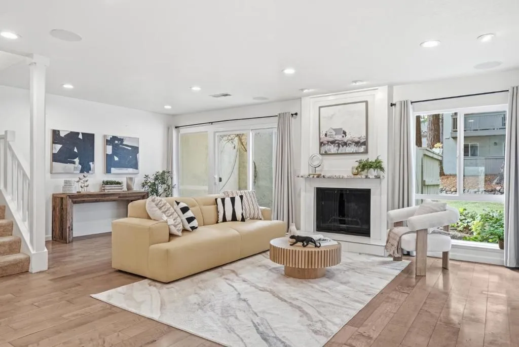 Beautifully updated 3-bedroom, 2.5-bath townhouse in the sought-after Vineyard community of Saratoga. This light-filled home features inviting open living area with recessed lighting, wide-plank style flooring, and cozy fireplace that creates a warm, modern atmosphere. Large sliding doors enhance natural light and provide seamless indoor-outdoor flow. The modern kitchen offers crisp white cabinetry, quartz-style countertops, stainless steel appliances, and generous workspace for everyday living and entertaining.Upstairs, the oversized primary suite boasts volume ceilings, abundant natural light, and private deck for outdoor relaxation. Roomy secondary bedrooms showcase vaulted ceilings, adding openness and architectural character. Residents enjoy resort-style amenities including pools, clubhouse facilities, and beautifully maintained grounds with scenic landscaping and water features. Conveniently located with easy access to Highway 9/85/280 and just minutes from downtown Saratoga, shopping, dining, and top schools. Enjoy low-maintenance living in a highly desirable community.