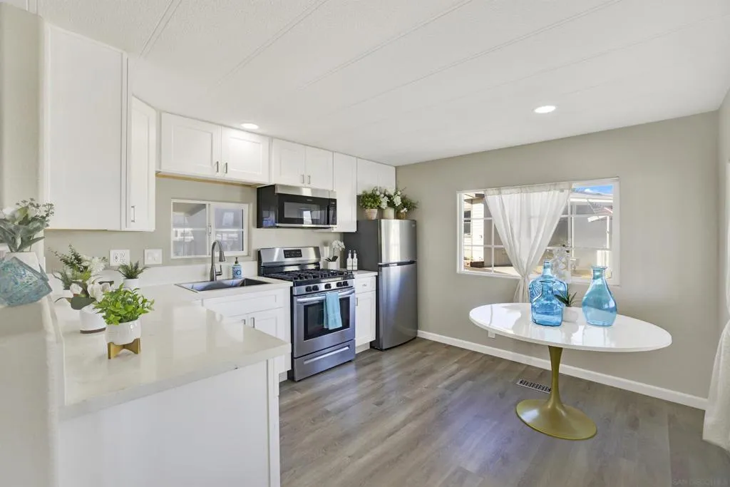 **LAND OWNED – 55+ Community in Sierra Vista Park!** Own the land in this highly desirable senior community in Vista! This affordable 1 bedroom, 1 bathroom home is located in the well-maintained Sierra Vista 55+ neighborhood. Beautifully upgraded approximately two years ago, the home features bullnose corners, fresh interior and exterior paint, vinyl flooring with updated baseboards, recessed lighting, and a remodeled kitchen with soft-close cabinetry, quartz countertops, stainless steel appliances, new sink, and disposal. Roof was recently resealed. The detached shed conveys and functions as a full laundry room with hookups plus additional storage. Low HOA dues of $275/month include sewer, trash, and basic cable. Community amenities include clubhouse, swimming pool, library and laundry room. Park improvements include gas and electric system upgrades to each unit, new street lighting, and freshly paved roads. Low-cost RV parking available. Conveniently located near shopping, dining, transportation and all that Vista has to offer. A great opportunity for affordable, land-owned senior living in North San Diego County. Located in the desirable city of Vista in North San Diego County, this property offers the perfect blend of small-town charm and everyday convenience. Enjoy a mild coastal climate, scenic rolling hills, and a strong sense of community. Vista features vibrant downtown dining, breweries, shopping, and year-round events, along with outdoor attractions such as Brengle Terrace Park, Alta Vista Botanical Gardens, and the popular Moonlight Amphitheatre. Convenient access to Hwy 78, I-5, and I-15 provides easy commuting, while North County beaches are just a short drive away. An ideal location offering lifestyle, recreation, and value.