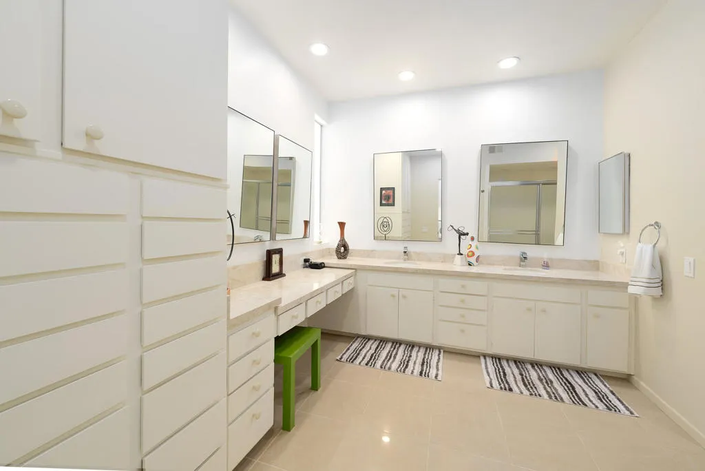 NON-OBSTRUCTIVE GOLF COURSE VIEWS!! This private, renovated, top-floor 2 bedroom/2 bath home is located in the Seven Lakes Golf and Country Club--also known as the ''Gem of the Desert''-- & is positioned above the HISTORIC 13th green where in 1968 President Eisenhower sank his only hole-in-one. Enjoy peaceful, quiet, non-obstructive views of the golf course and one of the seven lakes within the community. Play 18 holes of golf on the Ted Robinson designed golf course or socialize in the William Cody designed club house where dignitaries and Hollywood royalty have mingled for decades. Entering the home reveals 10 ft high ceilings and designer tile flooring. The extended terrace opens to a spacious living and dining area that is ideal for entertaining.Enjoy sunrises, sunsets and stunning 180-degree views of the San Jacinto and San Bernardino Mountains. The main bedroom suite offers a walk-in closet and oversized light-filled bathroom. Note that both bedrooms open onto an expansive sunroom with views of the mountains up to Southridge. A private two-car garage is also included in this special home.Perfect for full-time living or a seasonal investment property with a 24-hour guard gate, onsite HOA office, electric car charging stations, 15 heated pools and spas tennis/pickelball court. The William Cody designed clubhouse is private and offers neighbors enjoyment of a restaurant and bar.