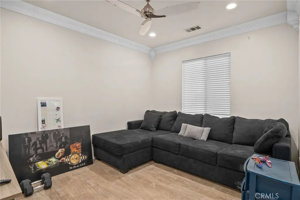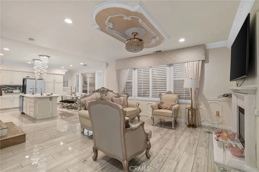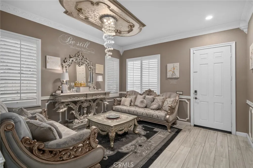 Take a trip into Parisian elegance with stunning wall woodwork and dazzling chandeliers that evoke timeless European charm. Welcome to this stunning West Covina residence, where classic sophistication meets thoughtful upgrades throughout. From the moment you arrive, the paved front porch sets the tone for the grace and refinement found inside. Step through the entry into the formal living room featuring plantation shutters, detailed wall woodworking, a breathtaking chandelier, and crown molding that adds warmth and character. French doors open to a serene courtyard, creating the perfect indoor-outdoor flow. The formal dining room is equally impressive with exquisite wall décor, plantation shutters, and an eye-catching chandelier that elevates every gathering with a touch of Paris-inspired luxury. Deeper into the home, the open-concept family room shines with custom drapery, striking chandeliers, rich wall woodwork, and a cozy fireplace. The space flows seamlessly into the beautifully upgraded kitchen and breakfast nook, offering both style and functionality. Sliding doors from the breakfast nook lead to the backyard, making entertaining effortless. A recently renovated full bathroom is conveniently located on the main floor. The garage has been thoughtfully converted into a bedroom complete with a custom closet, built-in cabinetry, ceiling fan, crown molding, and detailed wall woodwork—ideal for guests, extended family, or a private office. Upstairs, a versatile loft area provides additional living space, with crown molding continuing throughout. The primary suite is truly a retreat, showcasing crown molding, custom wall woodworking, plantation shutters, a ceiling fan, and elegant finishes. The stunning primary bathroom features custom lighting, an upgraded vanity and flooring, and a spacious walk-in closet—a true showpiece. Two additional bedrooms and a full bathroom with dual sinks complete the upper level, along with a dedicated laundry room with built-in cabinetry for added convenience. Ideally located near IKEA, major shopping centers, and convenient access to the 10 Freeway, this exceptional residence offers both luxury living and everyday convenience in one of West Covina’s most desirable areas.