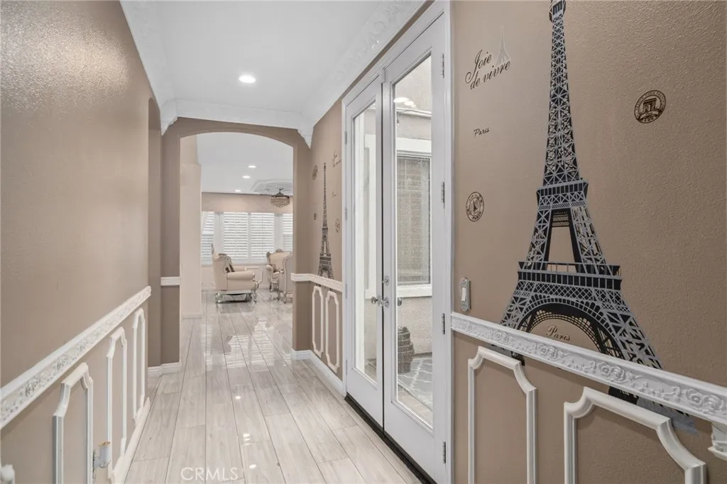 Step through the entry into the formal living room featuring plantation shutters, detailed wall woodworking, a breathtaking chandelier, and crown molding that adds warmth and character. French doors open to a serene courtyard, creating the perfect indoor-outdoor flow. The formal dining room is equally impressive with exquisite wall décor, plantation shutters, and an eye-catching chandelier that elevates every gathering with a touch of Paris-inspired luxury.