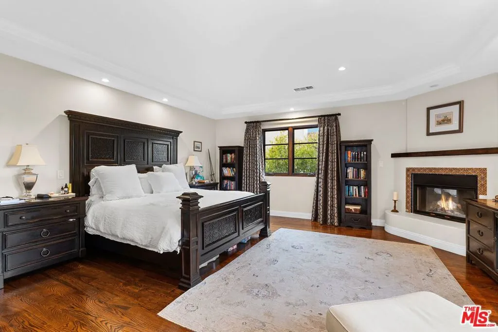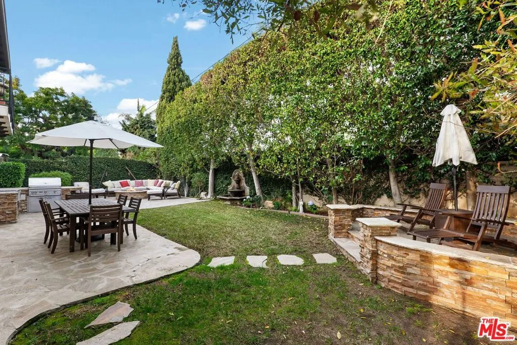 A stunning Italian/Mediterranean-inspired estate offering refined elegance, generous scale, and exceptional indoor-outdoor living. This expansive 5-bedroom, 4.5-bath residence is set behind a lush, private backyard designed for both relaxation and entertaining. The gracious living room features soaring beamed cathedral ceilings anchored by a magnificent marble fireplace, while the formal dining room impresses with a coffered ceiling ideal for elegant gatherings. The chef's kitchen showcases an oversized center island, Viking appliances, and opens seamlessly to an inviting family room with a custom fireplace. The first floor includes a private bedroom with adjacent full bath, a dedicated office, and an additional half bath, complemented by custom wood and marble flooring. A dramatic iron staircase beneath a custom skylight leads to an oversized upper landing, three additional bedrooms, two bathrooms, a laundry room, and an expansive primary master suite. The luxurious primary retreat features a custom fireplace, large walk-in closet, two additional closets, a grand spa-like bath with dual sinks, dual showers, and a Jacuzzi tub, plus a private balcony overlooking the backyard oasis. The outdoor space is highlighted by two fountains, beautiful flagstone hardscape, an oversized fire pit, and a built-in barbecue and beverage center perfect for entertaining year-round. Additional features include a tranquil Zen garden on one side of the home, a secured dog run with three cedar storage sheds on the other, and a two-car garage with secure overhead storage.