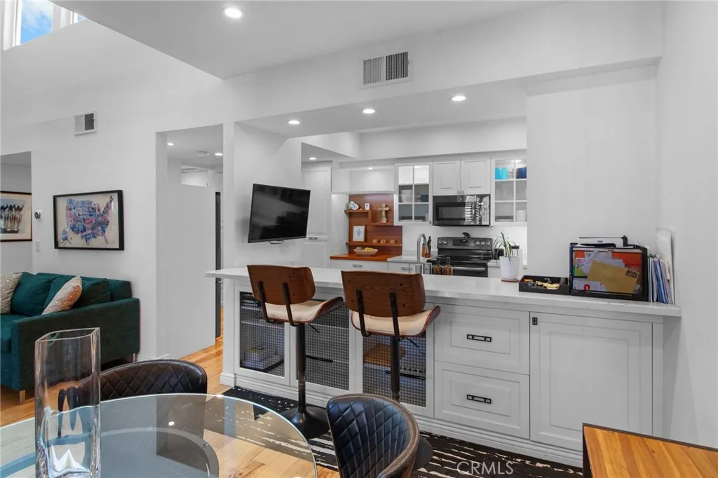 REDUCED!! Located in the Heart of Encino, this Stunning Top-Floor Penthouse offers a Complete High End Model Perfect Updating. The Home offers Soaring Cathedral Ceilings with an abundance of Natural Light Streaming through the Gallery-Style Dual Paned Windows. The Designer Kitchen is a Custom-Built Culinary Masterpiece featuring an Artisan-Designed Layout with Stone Countertops, Premium Stainless Steel Appliances, a Farmhouse Sink, Wine Refrigerator and Elegant Glass Cabinetry. The Unit has Gorgeous Wide-Plank Hardwood Floors that Flow throughout the unit. The Living Room includes a Wet Bar with a Wine Refrigerator, Beautiful Fireplace, perfect for Entertaining, along with a Sliding Glass Door that opens to the Spacious Tiled Balcony making it an ideal spot for an Urban Garden or Sunset Dining. The Primary Suite offers a Serene Retreat with Vaulted Ceilings, Dual Sinks, Multi-Mirrored Closets and a Lavish Primary Bathroom with a Dedicated Dressing Area. The Unit also includes Central Heating/AC, Recessed Lighting, All 4 Mounted TV's, Plantation Shutters and tons of Natural Light. It also includes 2 side-by-side Subterranean Parking Spaces with Additional Visitor Parking. Situated in the well-maintained "White Oak Encino" Complex, Residents enjoy a Resort-like Atmosphere with Lush Landscaping and Mature Trees. Amenities include a Sparkling Pool, Indoor Spa, Sauna & Recreation Room. HOA Perks: Dues cover Earthquake Insurance, Water, Gas, Trash and Common Areas Maintenance. The Complex is walkable to Ventura Blvd., Premier Shopping, Trader Joe's, World-Class Dining and Close to Freeway Access. Most of the furniture can be included as part of the sale.
