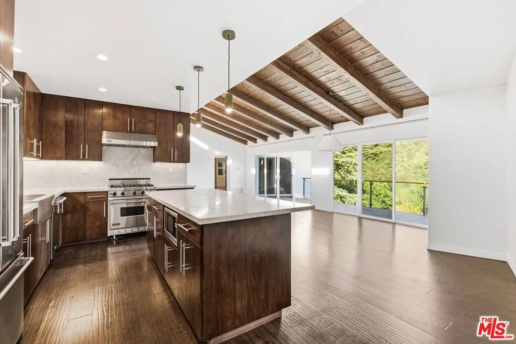 High above the city, tucked into the folds of the Hollywood Hills, 3476 Troy feels cinematic in the best possible way, dramatic, light-filled, and impossibly cool. From the moment you walk in, the vaulted wood-beamed ceilings steal the scene. Warm planks stretch overhead, drawing your eye toward walls of glass that open to an expansive balcony with sweeping green hillside views. It's the kind of living room that makes you want to host a wine night, write a screenplay, or simply sit back and watch the light shift across the canyon. Golden hour here deserves its own score. The open kitchen plays its part beautifully, with rich wood cabinetry, stone countertops, stainless steel appliances, and a generous island that anchors the space. It's equal parts functional and refined, ready for everything from morning espresso to late-night dinner parties that linger long after the credits would normally roll. Three spacious bedrooms offer flexibility for guests, creative space, or a proper home office with a view. The primary suite opens directly to the balcony, inviting in fresh canyon air and soft morning light. The bathrooms are clean and classic, including a spa-worthy shower clad in natural stone that feels both grounded and quietly luxe. An attached private garage adds convenience and extra storage, complete with a washer and dryer tucked inside for easy everyday living. Step outside and you'll find a long, private balcony stretching the length of the home, string lights overhead, a patio heater for cool evenings, and rolling hills that remind you why the Hollywood Hills remain so iconic. And yes, for film lovers, you're just moments from Universal Studios and the legendary house used in Alfred Hitchcock's Psycho. A piece of cinematic history tucked into the neighborhood, dramatic on screen, but here the only suspense is whether you'll snag this lease before someone else does. Elevated, design-forward, and undeniably vibey, this home is ready for its close-up.