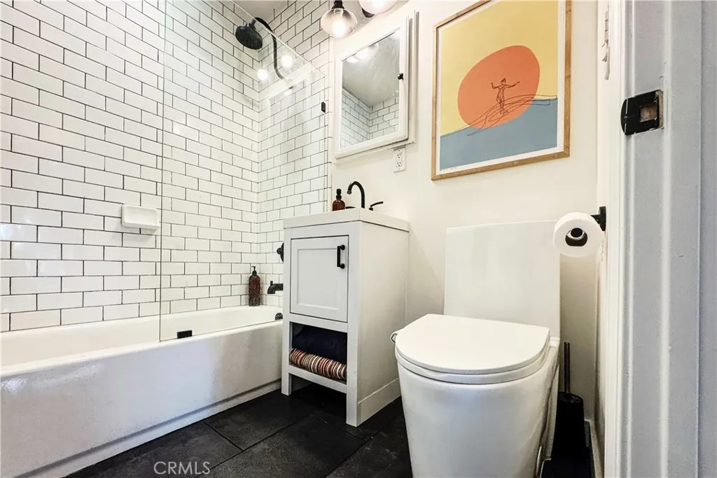 A detached one car garage, two on site parking spaces, and a custom mural by a surf artist add both function and creative identity. Major system upgrades include a rebuilt sewer line, updated electrical, earthquake retrofitting, tankless water heater, central fan system, and irrigation system.