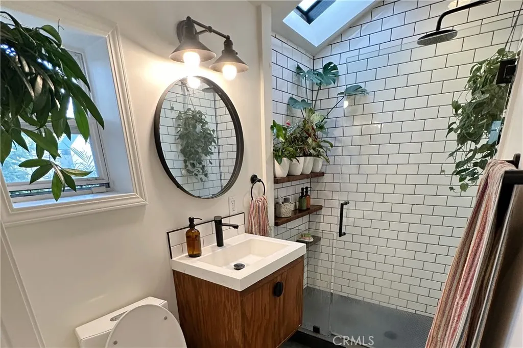 The home has been extensively upgraded with refined taste, including a modernized kitchen, beautifully remodeled bathrooms (one highlighted by a skylight and verdant accents that bring natural light and warmth into the space), refreshed flooring, and a fully repainted interior and exterior.