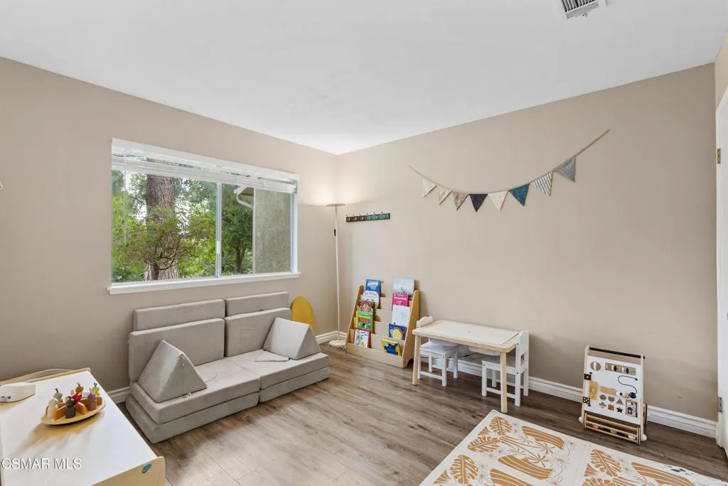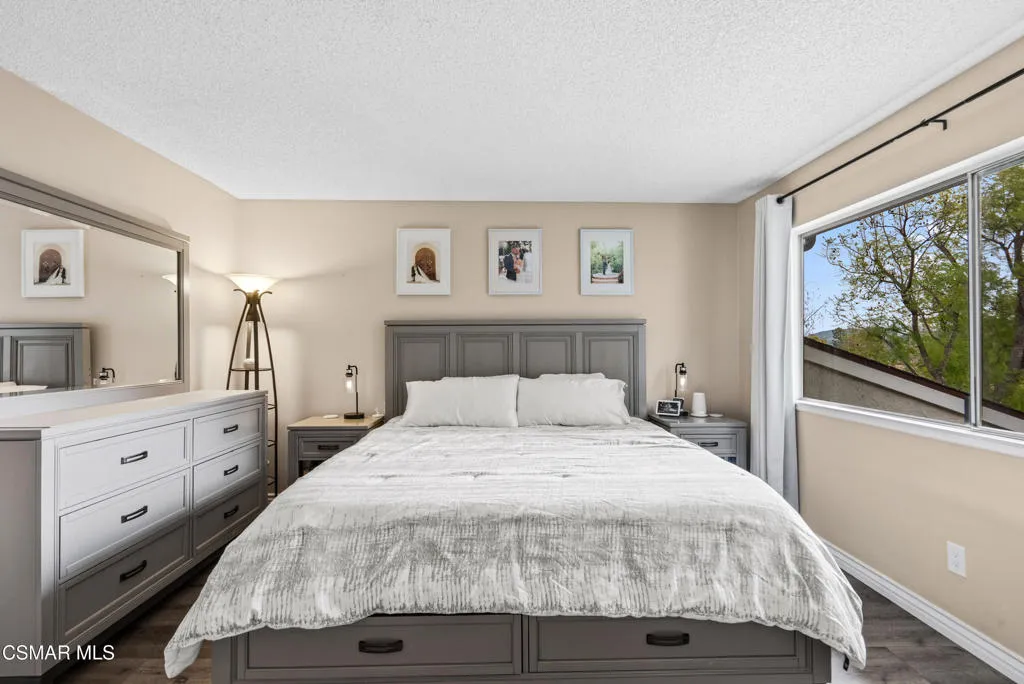 Located in the highly desirable Varsity Park community, this rare 4-bed, 2.5-bath townhome offers space, style, and a tranquil setting. Step inside to a light-filled open floor plan highlighted by wide-plank wood-like flooring and recessed lighting throughout the main living areas. The spacious living room features a stunning stacked-stone fireplace with a custom mantel and flows seamlessly through sliding glass doors to a private rear patio--creating the ideal indoor-outdoor lifestyle.The kitchen showcases crisp white cabinetry, stainless steel appliances, generous counter space, and a breakfast bar that opens to a spacious dining area--perfect for both everyday living and entertaining. The versatile layout includes a convenient downstairs bedroom and powder bath, ideal for guests, a home office, or multigenerational living. Upstairs, three additional bedrooms await, including a spacious primary suite with dual closets and abundant natural light. Additional highlights include central A/C, an in-unit laundry closet, and a 2-car detached garage with direct access to the back patio. Varsity Park offers lush greenbelts, mature trees, and two sparkling pools--providing a peaceful retreat just moments from everyday conveniences. Ideally located near shopping, parks, Moorpark College, and with easy access to the 118 and 23 freeways, this home delivers the perfect balance of comfort, convenience, and community. Welcome home!
