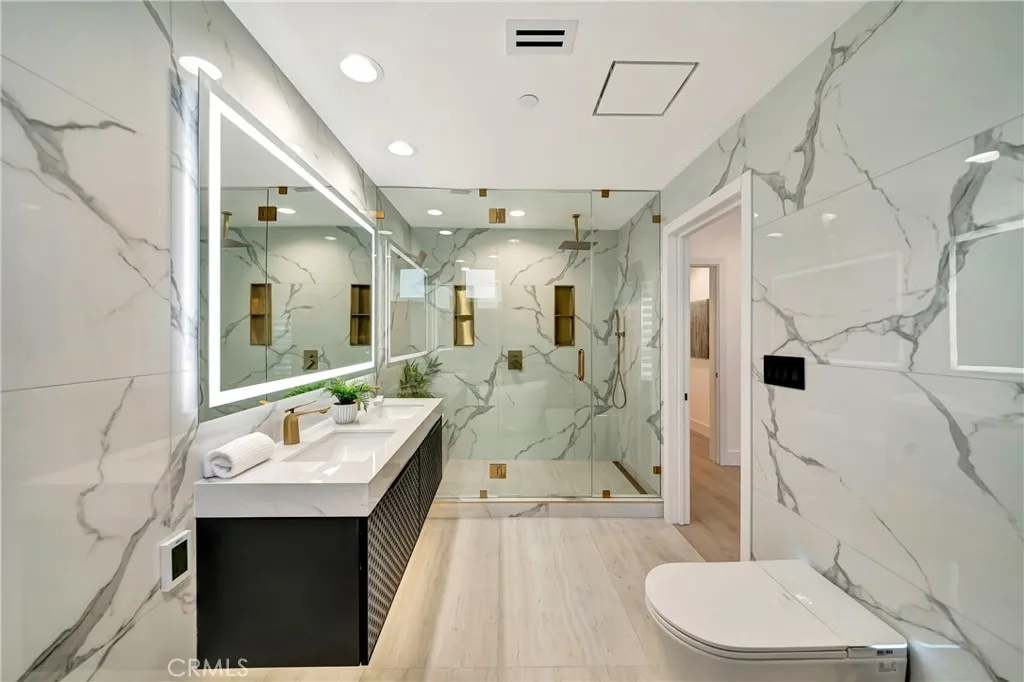 The brand-new European-style kitchen showcases gorgeous countertops and premium, never-used high-end appliances, designed for both everyday living and elevated entertaining. Every bathroom has been completely rebuilt into a spa-like retreat with radiant heated floors, smart toilets, smart mirrors, and cutting-edge shower systems delivering everyday luxury. The primary suite offers a serene escape with a spacious en-suite bath and walk-in closet, while the second bedroom features its own full bath and walk-in closet.