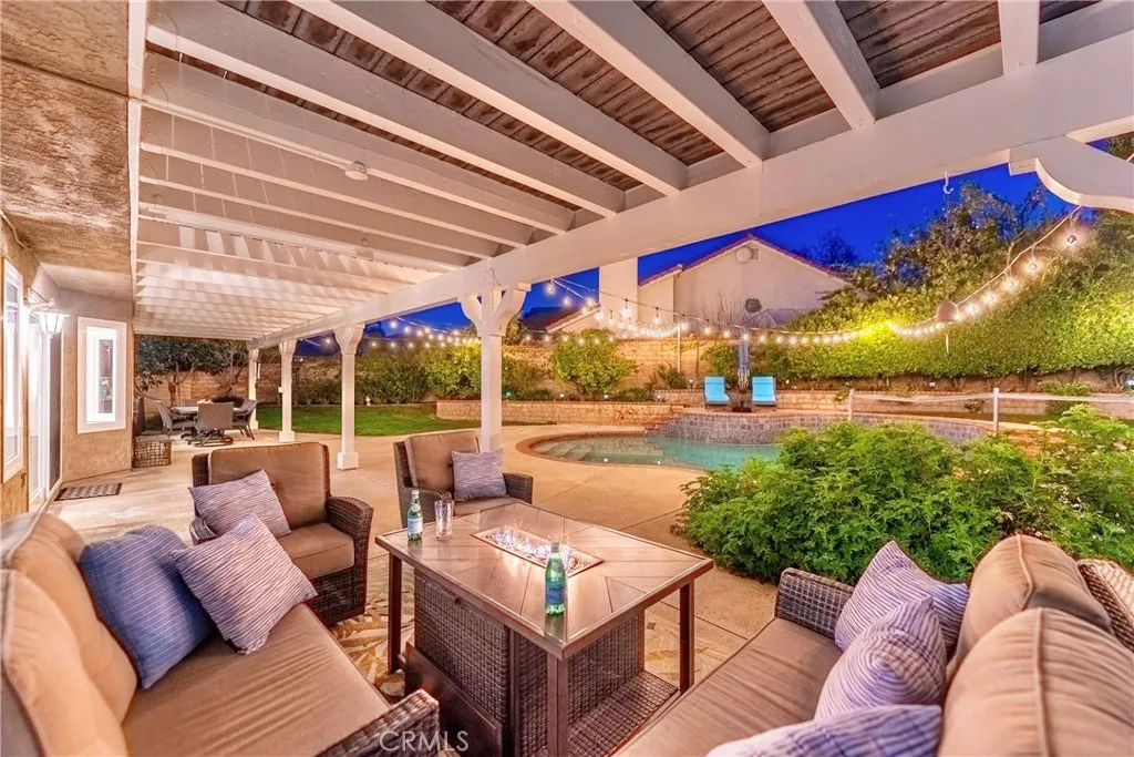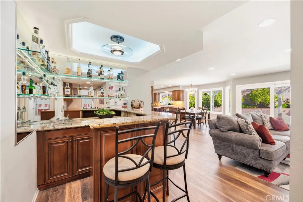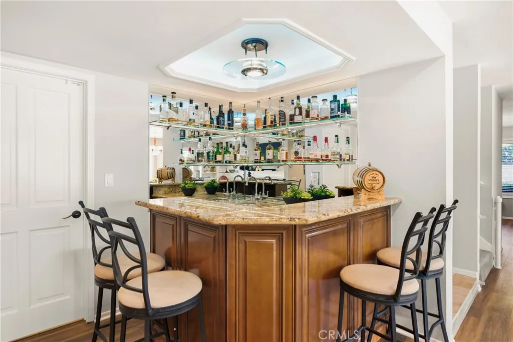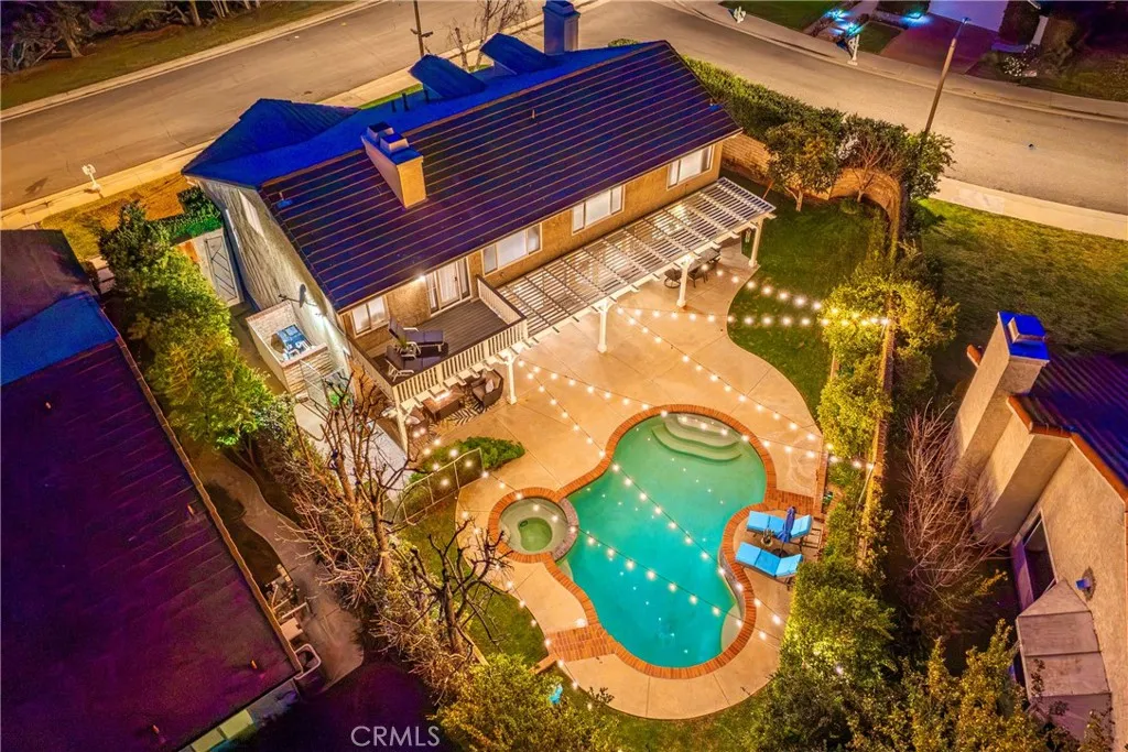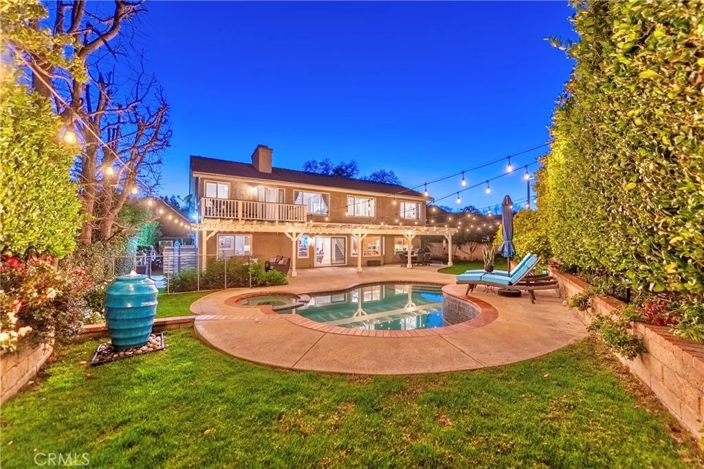 Inside, this 5-bedroom, 3-bathroom sanctuary balances a luxurious sense of style with the ease of daily life, having undergone a series of tasteful improvements. Every bathroom has been thoughtfully updated, while beneath the stairs, a temperature-controlled wine cellar waits for the perfect bottle. Nearby, a bar area glows with mood lighting, ready for the soft hum of a dinner party and the perfect evening ambiance. The spacious upstairs primary suite is a retreat unto itself, where a private balcony catches the breeze and a flickering fireplace warms a bonus space meant for morning coffee or a quiet seating area. A well-appointed downstairs bedroom offers a quiet corner for visiting guests or a private home office for remote work. Finally, the back door slider opens to your own private yard of avocado, grapefruit, and lemon trees. The air smells of citrus blossoms, and the pool, secured by a children’s gate, anchors long afternoons of splashing in the sun while the jacuzzi promises endless relaxation and fun beneath the stars.