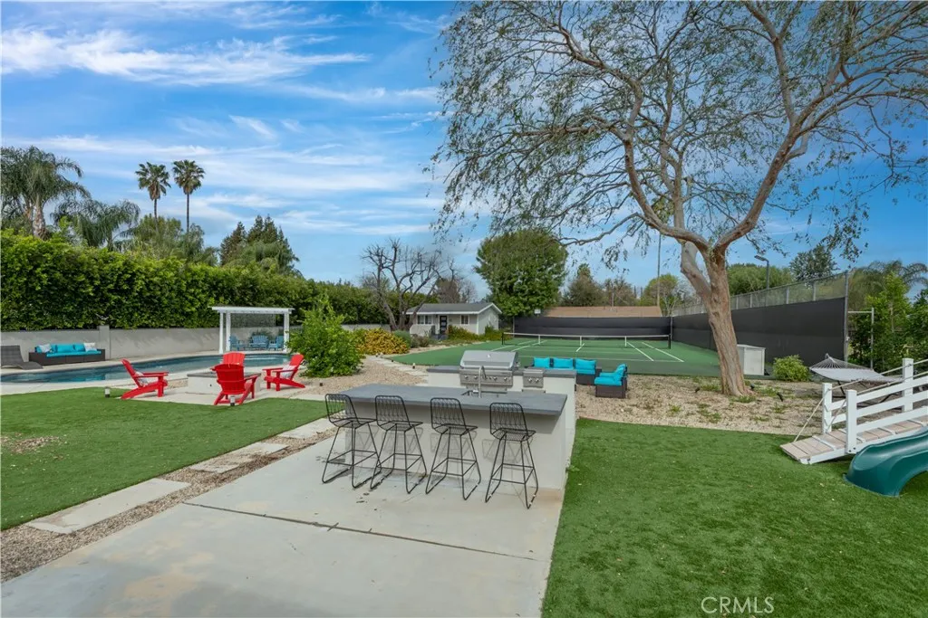 Welcome to your own private retreat in the heart of Walnut Acres. Tucked behind gates on nearly one flat acre in the highly desirable Walnut Acres, this extraordinary estate offers a private compound where luxury, comfort, and resort-caliber amenities converge, making every day feel like an escape. The main residence offers 5 bedrooms and 4.5 bathrooms, thoughtfully designed within a flexible dual-wing layout that blends privacy with functionality. Step through impressive 8-foot double doors into a stunning formal living and dining salon, anchored by a dramatic floor-to-ceiling marble fireplace. The west wing is devoted to the luxurious primary suite — a serene retreat with direct access to the covered patio and resort-style grounds. The suite features a custom designer walk-in closet complete with built-in steamer and a spa-caliber bath offering a soaking tub, oversized wet-room shower, and curated finishes throughout. An adjacent ensuite bedroom provides flexibility for a private lounge, executive office, nursery, or wellness studio. The east wing hosts three additional sunlit bedrooms — two with direct backyard access — along with two beautifully appointed baths featuring custom vanities and glass-enclosed showers. At the heart of the home lies a true showpiece: an expansive chef’s kitchen and adjoining den designed for gathering at scale. A breathtaking 12-foot quartzite island anchors the space, complemented by professional-grade Dacor appliances, a glass-enclosed wine display, dedicated breakfast area, and seamless indoor-outdoor flow to the covered patio. Mature landscaping surrounds a PebbleTec pool with waterfall feature, a charming putting green, multiple outdoor lounge areas, fire pit gathering space, and a fully equipped outdoor kitchen with BBQ, prep sink, and refrigeration. A professional-size tennis court enhances the estate’s lifestyle appeal, creating a true at-home retreat. The detached garage has been thoughtfully converted into a fully outfitted recording studio — ideal for musicians, producers, podcasters, or as a private content creation space. In addition, a fully equipped detached guest cottage offers one bedroom and one bathroom, along with a full kitchen and laundry — perfect for extended family, guests, a separate executive workspace, or offering exceptional potential for supplemental rental revenue. When you live here, every day feels like a getaway — and you may never want to leave home again.