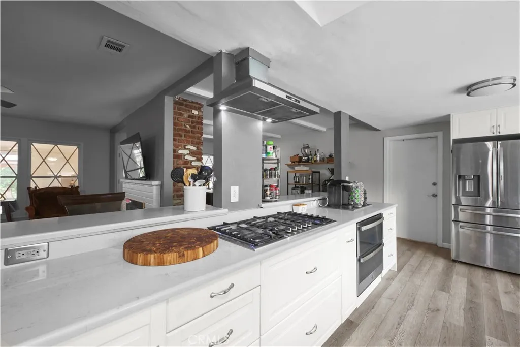 The remodeled kitchen offers abundant counter space, a breakfast bar, quartz countertops, elegant glass-front display cabinetry, a five-burner range with stainless designer hood, and a spacious breakfast nook overlooking an inviting bay window.