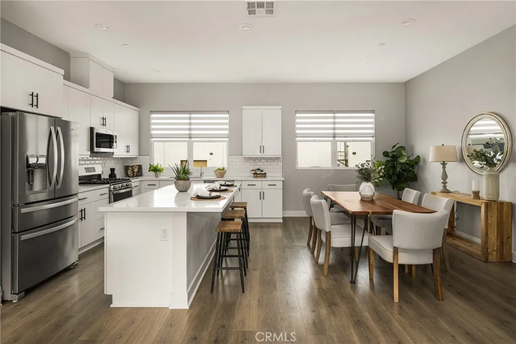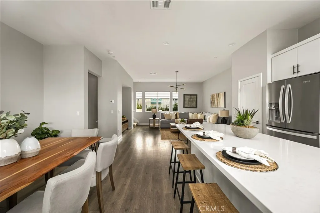 Turnkey Modern Townhome in the heart of Anaheim’s Platinum Triangle featuring 3 Bedrooms plus a Den, a PRIVATE ROOFTOP DECK, and a direct-access 2-car garage. Ideal for a first-time buyer or investor, with strong rental potential of approximately $4,300 per month. Tucked toward the back of the community, the home offers enhanced privacy in a prime location. The thoughtfully designed floor plan begins with a Den and Powder Room upon entry, providing flexible space for a Home Office, Gym, or sitting area. The Second Level showcases an expansive, light-filled Great Room with high ceilings and walls of windows that flood the space with natural light. The open Chef’s Kitchen is designed for entertaining and features white shaker cabinetry, quartz countertops, a white subway tile backsplash, stainless steel appliances, and an oversized island that flows seamlessly into the Dining Area and Great Room. The Third Level offers 3 generously sized bedrooms, including a luxurious Primary Suite with a spa-inspired bathroom, dual vanities, walk-in shower, and a large walk-in closet. secondary bedrooms are thoughtfully positioned at the opposite end of the hall and share a spacious guest bathroom with a soaking tub. Laundry is conveniently located on this level. Escape to the Oversized Private Rooftop Deck to enjoy stunning City and Pool Views. Perfect for relaxing, entertaining, and stargazing, this space truly elevates the home. Energy-efficient features include EV charging, a tankless water heater, and a dual HVAC system. Located just minutes from Disneyland, the Honda Center, Angels Stadium, the exciting OCVIBE development, and major freeways. Modern living, low maintenance, and an unbeatable location that puts you right in the center of it all. This is a must-see.
