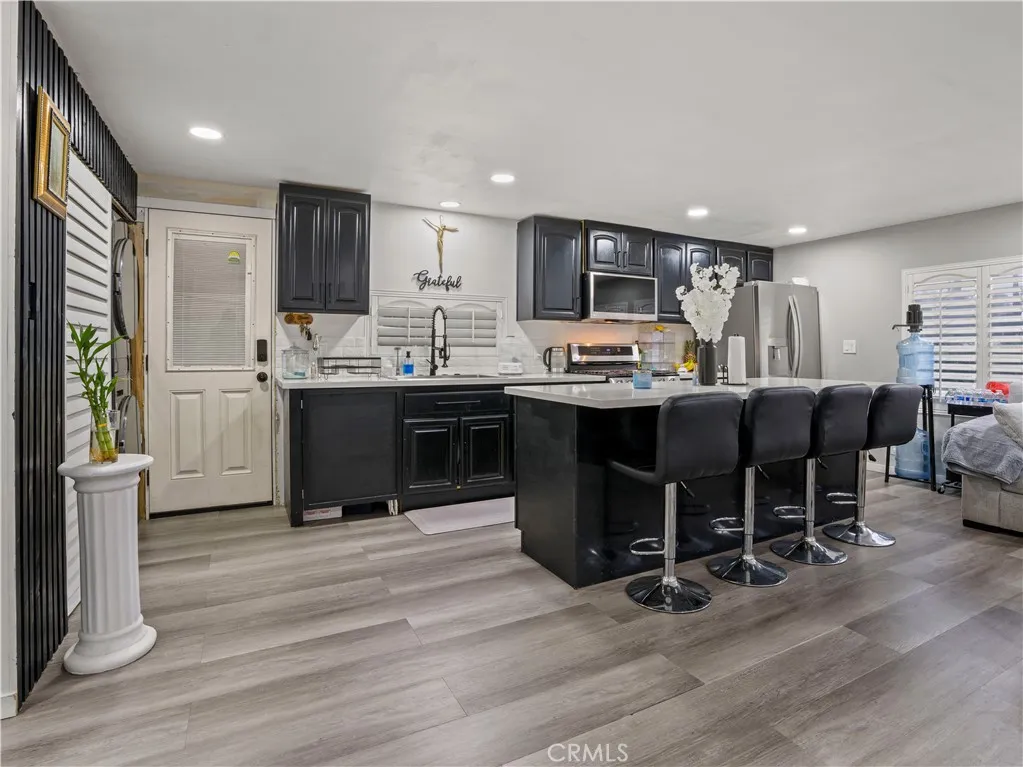 Located in Reche Canyon Mobile Estates, this beautifully updated 2-bedroom, 1-bath manufactured home offers approximately 800 sq ft of modern living space. The open-concept layout features updated flooring throughout, recessed lighting, and abundant natural light. The remodeled kitchen showcases dark cabinetry, quartz-style countertops, stainless steel appliances, a subway tile backsplash and an oversized island that opens to the living area, perfect for everyday living and entertaining. The exterior includes a covered carport, low-maintenance landscaping and a private backyard area with a storage shed for added convenience. Ideally located near shopping, dining, and freeway access. A great opportunity for affordable homeownership in Colton. Space rent for new buyer subject to park approval and applicable local regulations.