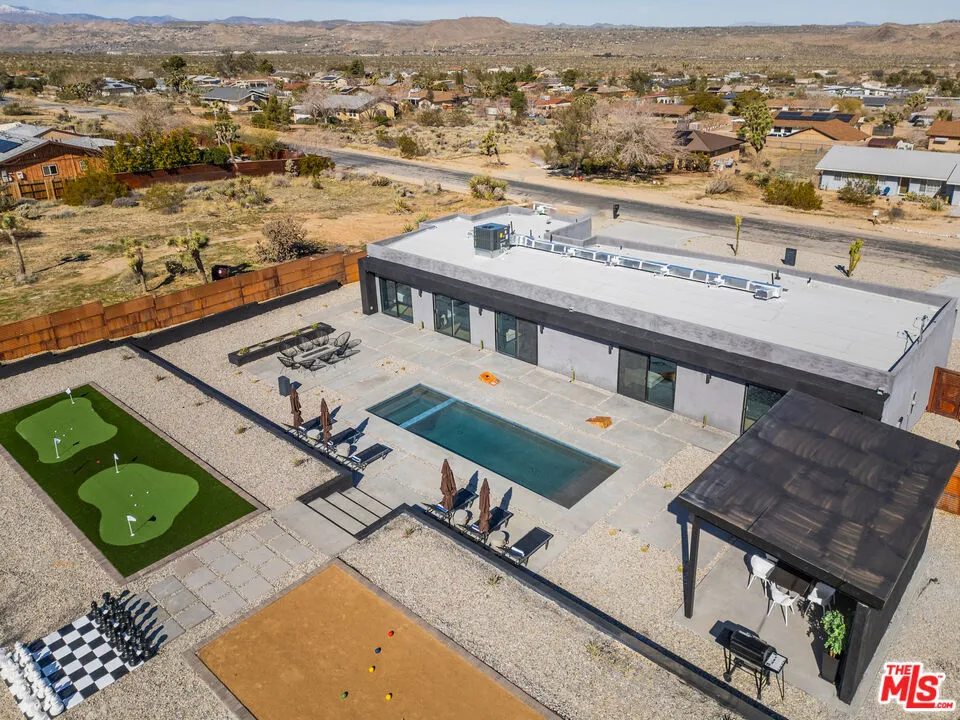 Located in the heart of Joshua Tree, this fully remodeled 5-bedroom, 3-bathroom retreat is a proven high-performing short-term rental generating $205,000 in verified 2025 income. Set on an approximately 18,040 sq ft lot, the 2,276 sq ft single-story home offers privacy, scale, and a resort-style experience that consistently attracts large group bookings. Remodeled in 2024, the home was thoughtfully upgraded with revenue performance and guest experience in mind. The open-concept living area features a spacious gathering room with a 65-inch smart TV and electric fireplace, creating a natural hub for entertaining. The oversized kitchen includes a large island, ample counter space, and a full suite of appliances ideal for extended stays and group travel.The five-bedroom layout comfortably accommodates larger parties, a key driver of strong occupancy and premium nightly rates in the Joshua Tree short-term rental market. Each space has been modernized to deliver a clean, turnkey experience.The backyard operates as a private entertainment compound, offering a luxury swimming pool and spa, bocce ball court, and mini golf course within a spacious and private setting. These experiential amenities directly support repeat bookings and sustained annual performance. Additional features include central A/C, high-speed Wi-Fi, EV charger, attached garage, and patio space for outdoor lounging and dining. All furnishings may be included in the sale, allowing for a seamless transition. Existing professional property management is in place and can remain, providing immediate operational continuity for an investor. Turnkey and income-producing from day one, this is a rare opportunity to acquire a stabilized STR asset with documented performance in the Joshua Tree market. Financials and booking history available upon request.