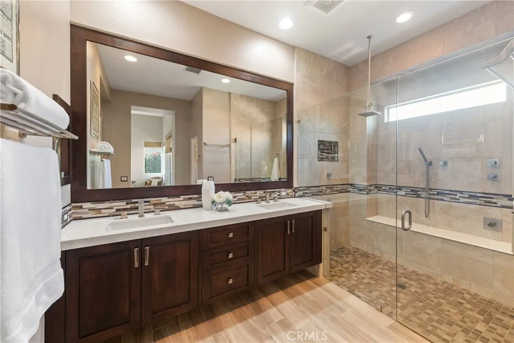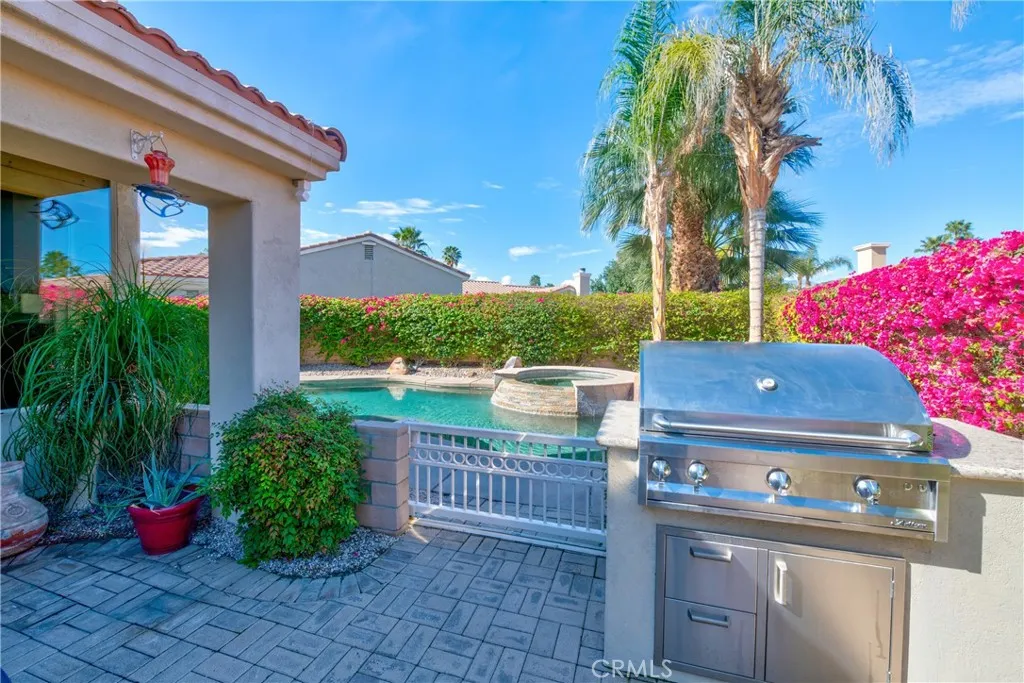 Welcome to this beautifully appointed single-story home in the highly sought-after gated community of Lantana in Palm Desert. This gorgeous and meticulously maintained home is perfectly positioned on a rare, sprawling lot within a peaceful cul-de-sac. This stunning home blends indoor-outdoor living to its finest with an entertainer’s dream backyard, featuring 2,500 sqft, 3 bedrooms, 2.5 baths, and a 2-car garage with lots of storage. The expansive and very private backyard offers a resort-style pool and spa with waterfall, sun patios, mature palm trees, a covered patio with pavers, and a built-in grill all surrounded by impeccably kept lush landscaping with custom outdoor lighting. The interior of this home boasts turnkey condition with soaring ceilings, gleaming wood and tile floors, custom paint and window coverings. The perfect entertaining “great room” has been upgraded with stainless steel appliances, custom backsplash, gorgeous granite countertops, double ovens, and a large center island with bar seating overlooking the spacious family room with cozy fireplace and a view of lush back yard. Your private desert oasis awaits!
