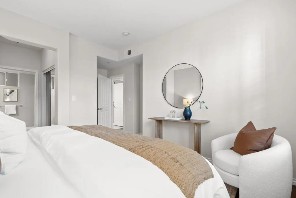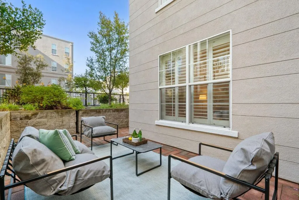 Located within the gated Miraval Community of Santa Clara, this rare first-floor end unit offers a sophisticated sanctuary with direct poolside access. The beautiful interior features rich hardwood flooring and plantation shutters and fresh new paint throughout. The remodeled kitchen is finished with new Quartz countertops and modern touches, and a separate dining area with a contemporary chandelier adds style and functionality. Distinguishing this residence is an expansive wrap-around patio that provides a private, resort-like retreat just steps from the sparkling community pool and spa. The thoughtful layout includes two spacious bedrooms with peaceful pool views, in-unit laundry, and the added convenience of two reserved parking spots with access to EV charging. Residents enjoy a true luxury lifestyle with exclusive amenities such as a swimming pool, spa, gym, clubhouse, and movie theater. Conveniently located near Rivermark Plaza, parks, trails, and major tech employers such as NVIDIA, Intel, Google, Apple, and Oracle, with easy access to Highways, and Google shuttle bus stop right outside the community.