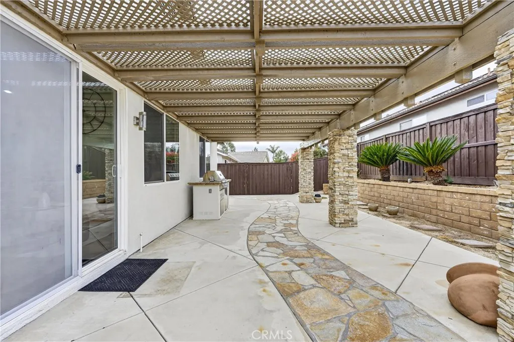 Arrive at this desirable end-corner, single-story home offering added privacy and beautiful natural light in the sought-after Four Seasons 55+ community. Brazilian wood flooring flows through the main living areas, enhancing the open-concept design and warm, inviting feel. The kitchen features granite countertops, abundant cabinetry, a center island, and appliances, all seamlessly opening to the spacious family room and adjacent large dining area perfect for everyday living and entertaining. This well-designed floor plan offers two bedrooms and two baths, thoughtfully separated for privacy. The primary suite is tucked away with its own en suite bath, while the secondary bedroom and bath are ideally positioned on the opposite side of the home for guests. Double doors lead to a private office with built-in cabinetry, ideal for working from home or a quiet den. An indoor laundry room with sink and ample storage provides direct access to the two-car garage. Step outside through the sliding glass door to a low-maintenance backyard featuring concrete hardscape, a patio cover, and a BBQ area ready for relaxing or grilling. Enjoy resort-style living with 24-hour gated security and exceptional amenities including a grand lodge and ballroom, on-site bistro, library, billiards room, state-of-the-art fitness center, salon, pool and spa, plus tennis, pickleball, bocce ball, and a vibrant calendar of social activities.