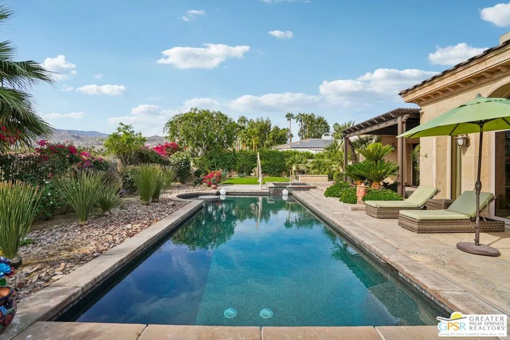 Sophisticated luxury meets timeless elegance in this exceptional Clancy Lane estate in one of Rancho Mirage's most prestigious addresses. From the moment you arrive via the circular drive and enter the gated courtyard with its tranquil fountain and grand custom doors, the home sets a tone of refined desert living. A dramatic foyer leads to the formal living room, where a stacked-stone fireplace, soaring ceilings, and French doors showcase sweeping south-facing mountain views. The chef's kitchen is a culinary masterpiece, featuring illuminated mahogany cabinetry, granite surfaces, a generous prep island with counter seating, 100-bottle wine cooler, and elite appliances including buit-in Sub-Zero refrigerator, Dacor Range top, Miele Dishwasher, Wolf double ovens, and a warming drawer. Seamless flow connects the kitchen to both the intimate dining area and the inviting family room. Designed for effortless indoor-outdoor living, the residence features an expansive entertainment pavilion complete with built-in gas BBQ, mini refrigerator, mini dishwasher, sink, granite counters, ceiling fan, and outdoor TV. The resort-style half acre plus backyard offers a PebbleTec pool and spa, each with independent heating systems plus a new 'Estate Green' putting green, Sonus outdoor speakers, automatic landscape lighting, and a cooling misting system for warm desert days. The thoughtfully designed floor plan provides exceptional privacy with two primary suites and an additional ensuite guest bedroom, each with patio access and electric roller shades. Additional highlights include a finished 3-car garage with extensive cabinetry and refrigerator, a spacious interior laundry room with office niche, and a host of significant upgrades: double insulation, owned new solar panels, four new A/C condensers, two new furnaces, two new tankless water heaters, and a new Kinetico water softener and filtration system, plus a built-in lighting control system . The home is also equipped with a security system 8 exterior and 2 interior Ring cameras. 20 Clancy Lane Estates is a rare offering of elegance, comfort, and impeccable craftsmanship. This Clancy Lane estate embodies the pinnacle of Rancho Mirage luxury living.