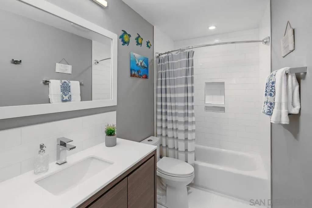 Relax in this quiet remodeled top floor condo and luxurious master suite. The pirmary suite was re-configured to feature a decadent bathroom and a custom closet. Spacious 2nd bedroom and updated 2nd bath. This home has central air & heat plus ceiling fans in both bedrooms. Centrally located near SDSU, freeways, downtown, shopping