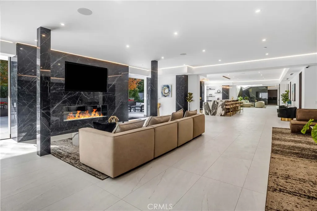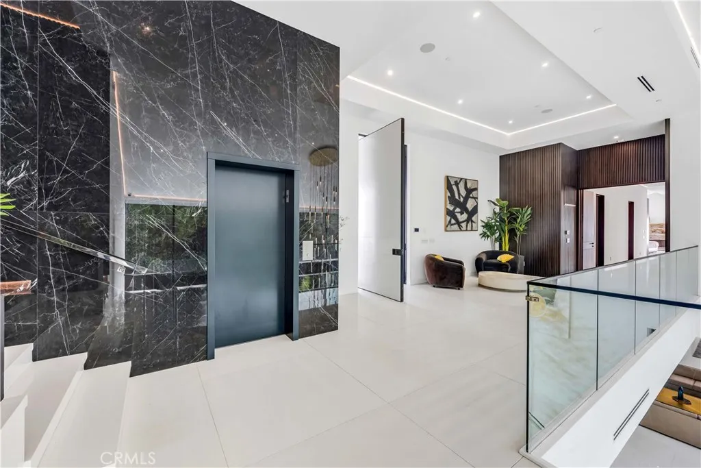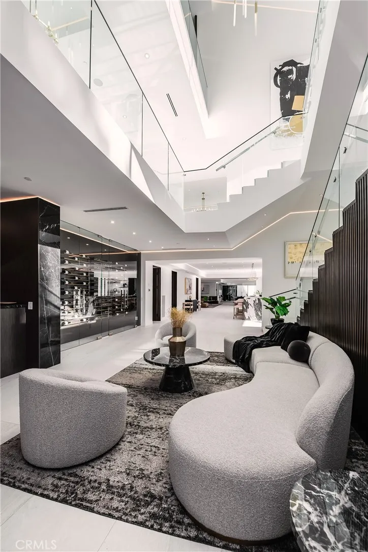 A breathtaking expression of sleek, modern architecture and elevated luxury, this newly constructed gated estate rests along Bel Air's prestigious Billionaire's Row. Beyond the impeccably landscaped courtyard is an extraordinary 20,000 square foot interior, masterfully designed to capture sweeping unobstructed views surrounded by some of the world's most valuable real estate. Created for grand scale entertaining, the seamless multi-level floor plan reveals expansive living spaces defined by dramatic linear fireplaces, soaring ceilings, and walls of automated glass that effortlessly merge indoor and outdoor living. Floor to ceiling windows flood the home with natural light while framing spectacular vistas; by evening, designer pendants, contemporary chandeliers, and refined recessed lighting create an intimate, sophisticated ambiance. All three levels are accessed by a statement staircase or commercial grade elevator and are appointed with premier amenities. Five sumptuous bedroom suites each with bespoke finishes, spa-inspired baths, generous walk-in closets, and private balconies, offer exceptional comfort. The primary suite is a retreat unto itself, showcasing vaulted ceilings, an elegant fireplace and expansive wraparound balcony, dual boutique style closets, and two lavish spa baths featuring oversized waterfall showers and a sculptural soaking tub. Additional highlights include a state-of-the art theater, fully equipped fitness center, wet and dry saunas, and a private salon/spa room. Outdoors, a striking infinity edge pool commands dazzling city views. A truly unique feature of the property is its massive subterranean garage and outdoor space, which can accommodate almost 50 vehicles, a rarity in Bel Air. This extraordinary estate presents a rare opportunity to experience uncompromising design, comfort and world class luxury. Seller to carry 50% at a 7% interest.
