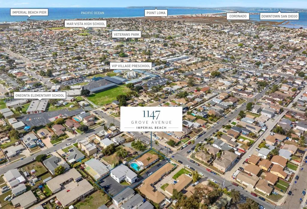 We are pleased to present 1147 Grove Avenue, a recently renovated six-unit property located in the charming family-friendly coastal community of Imperial Beach, San Diego's most southern beach town. This unique offering provides a phenomenal owner-user house hack opportunity with a large front house on Grove Avenue and five apartment units in the back. The property sits on a generous 20,129 square foot lot offering potential for construction of multiple ADU units making it an attractive investment for both owner-users and value-add investors. The property consists of six large fully renovated apartment units, three of which are furnished. There are (4) three-bedroom, one-bath units, (1) two-bedroom, one-and-a-half bath townhouse and (1) three-bedroom, two-bathroom detached house at the front of the property. The extensive renovations completed in 2024 have modernized both the unit interiors and exterior of the property. The upgrades include hard surface countertops, new appliances, new cabinetry, vinyl plank flooring, air conditioning, exterior paint and stucco, a new roof, new electrical systems, and refinishing of the pool and pool area. Additionally, the parking lot has been re-slurried and striped, providing ample parking with a total of 12 surface spaces. Since 2015, only 29 new apartment units have been constructed in Imperial Beach, excluding ADU units. This scarcity of new and well-maintained units creates high demand for properties like 1147 Grove Avenue, which offers large modern, turnkey living spaces.