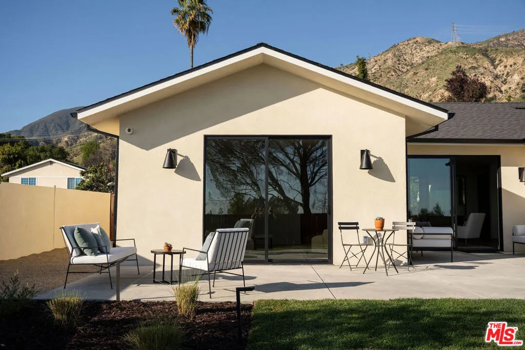Originally built in 1964 and masterfully rebuilt in 2025/26, this 4 bedroom, 3 bathroom one-story residence spans approximately 3,245 square feet and blends striking modern design with the enduring charm of Altadena. Set behind a dramatic stucco + stone-clad facade and surrounded by serene, artfully landscaped grounds, the home offers a rare sense of privacy, beauty, and intention. Inspired by the original footprint, the property was meticulously reconstructed following the Eaton Fire, with a deep commitment to craftsmanship, quality materials, and honoring the spirit of the Altadena community. A path of stone pavers winds through native plantings and sculptural olive trees, leading to a striking glass double-door entry that sets the tone for the designer sanctuary within. Inside, a grand open layout unfolds beneath soaring ceilings. A versatile den flows seamlessly into a spacious family room with custom built-ins, a mounted flat-screen, and a whole-home speaker system, creating an ideal environment for everyday living and effortless entertaining. Beyond, a sun-filled dining area connects to an impeccably designed chef's kitchen, anchored by a generous island with bar seating, stunning countertops, and custom cabinetry accented with elegant brass hardware. High-end Thermador appliances include a range, microwave, integrated refrigerator and dishwasher, complemented by Zephyr under-counter refrigerator drawers and a wine refrigerator. Multiple sliding glass doors open to the outdoors, maximizing the home's seamless indoor-outdoor flow. Thoughtfully designed for comfort and privacy, the home's layout places the expansive primary suite in its own east wing, creating a serene retreat set apart from the additional bedrooms. Sliding doors frame a tranquil yard and mountain views, while a large walk-in closet and spa-inspired bath elevate the experience with a double vanity, chic Star & Cross tile floors, an oversized shower, and a separate soaking tub. On the opposite side of the home, the west wing hosts the remaining bedrooms, offering ideal separation for family or guests. Two generous bedrooms share a beautifully appointed Jack-and-Jill bath with dual vanities and a tub-shower combination. A fourth bedroom, a stylish hall bath with striking slate tile floors and elegant shower, a dedicated laundry room, and built-in hall storage complete this well-appointed wing. Outdoors, the backyard is an entertainer's oasis. A sprawling lawn offers space for play and relaxation, framed by olive trees, native plantings, and sweeping mountain views. Host dinner parties beneath the covered patio off the kitchen, gather in the open-air entertaining patio beneath the stars, or simply enjoy the tranquility of this thoughtfully designed outdoor retreat. The home is outfitted with thoughtfully integrated modern systems, including a full Control4 smart home system with Lutron lighting, integrated Sonos whole-home audio, central iPad control, security system with exterior cameras, and Starlink internet with two years prepaid. Major infrastructure upgrades include all-new HVAC, a tankless water heater, updated electrical and plumbing, a new sewer line, and underground power lines. Fire-conscious construction was a priority, with a spark-resistant composition roof, concrete composite siding under the eaves, and low-flammability exterior materials. A two-car garage completes the home, offering epoxy flooring, generous storage, and pre-wired for an EV charger. Ideally located in Altadena, the property is moments from beloved neighborhood favorites, including Unincorporated Coffee Roasters, Stumptown, Betsy, Miya, Prime Pizza, and many others, as well as easy access to hiking trails, outdoor recreation, and the scenic foothills of the San Gabriel Mountains. Carefully rebuilt with intention, design, and durability in mind, this exceptional home offers a rare opportunity to enjoy modern living while honoring the soul of a classic Altadena retreat.