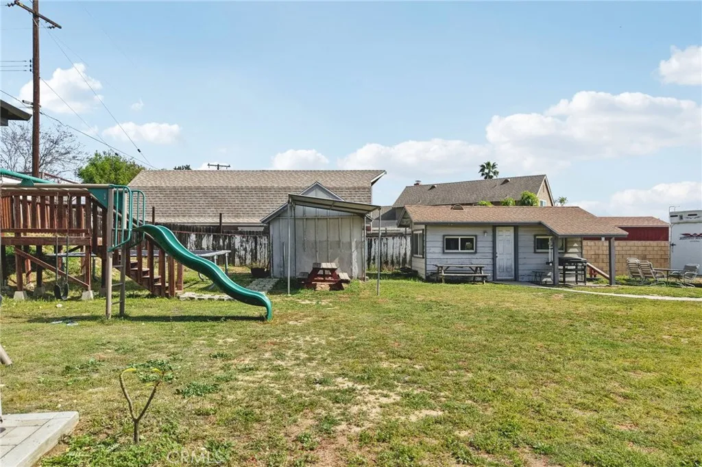 Outdoor amenities include a covered back patio ideal for entertaining, a charming gazebo, a storage shed with electricity, and a pull-through driveway for added convenience. An RV dump station is already in place, making this property even more functional for recreational vehicles or guests. The backyard has been enhanced with grading and slope work, a cement block wall along the east boundary, vinyl fencing along the rear boundary, and a front-yard sprinkler system with timer for easy maintenance. An older barn currently used for storage offers excellent potential to be restored for horses or livestock, completing this nearly one-acre property designed for country living with modern comfort.