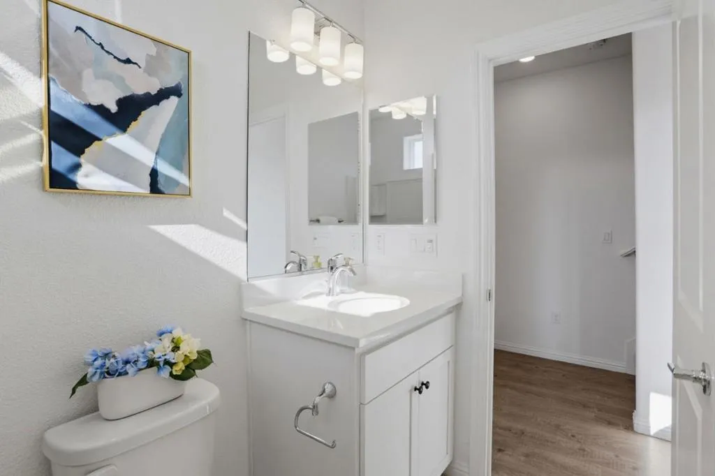 Immaculate and impeccably maintained, this corner unit townhome boasts a premium location with stunning open views. It features abundant large picture windows offering lush views and opulent soothing natural light. Spacious foyer with the front door facing central garden area. This practical floor plan is decorated in contemporary neutral colors with quality laminate wood floors throughout. The open functional kitchen is equipped with ample white Shaker cabinets, SS appliances, expansive quartz counters and a sizable central island with convenient breakfast bar. The generous and airy master suite includes tasteful mid-century chandelier, walk-in closet with elaborate organizers, and a lavish ensuite bath with a large shower and dual-sink vanity. The secluded main floor guest/in-law bedroom is adjacent to a full bath, providing privacy and convenience. Additional features including built-in kitchen water filter and central water softener. Special amenities in this community include BBQ/picnic area and dog park. Enjoy outdoor activities in the nearby Newbury Park. Convenient location: Short commute to downtown San Jose, Japantown, and shopping centers like Costco, Ranch 99, and H-Mart. Easy access to BART, VTA, freeways 101/680. Walking distance to Google and Meta shuttle stops.
