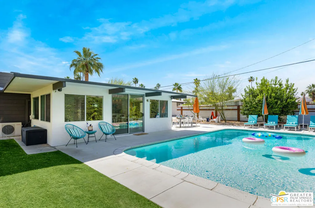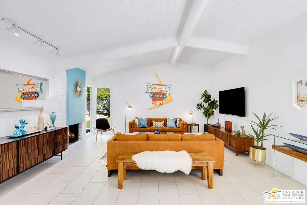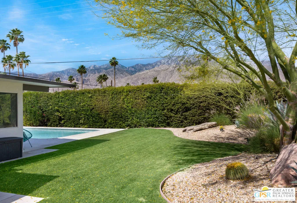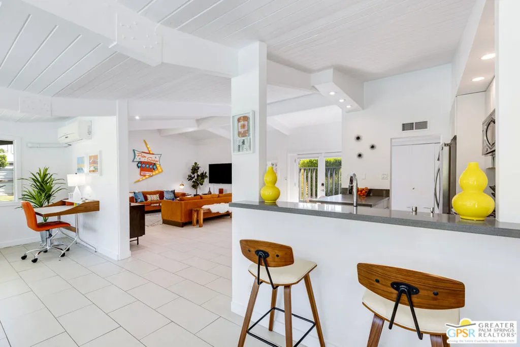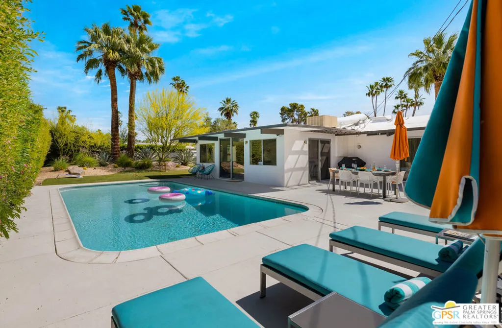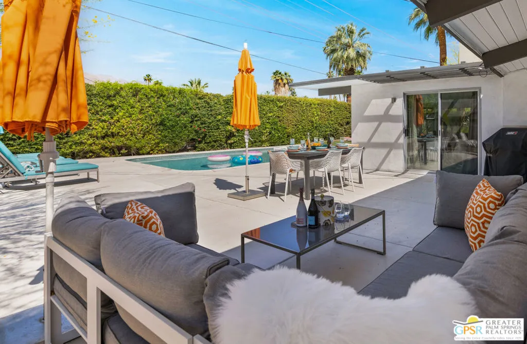 Mid-century modern Alexander home designed by Palmer & Krisel, located in Sunrise Park with stunning mountain views. Built in 1958, this iconic architectural style is known for its clean lines, vaulted tongue-and-groove ceilings, exposed beams, and signature brick fireplace. Privately gated with an automatic driveway gate and centrally located near downtown Palm Springs, the home offers flexibility as a full-time residence, second home, or investment property. The 3-bedroom, 2-bath layout features an expanded family room and dining area, creating generous living space filled with natural light. The remodeled kitchen connects directly to the main living areas, and sliding glass doors open to a west-facing patio and large pool with west facing mountain views. A heated spa, fire pit, and professionally landscaped front and rear yards create a true desert retreat. The primary suite has direct pool access, ample closet space, and a large walk-in closet. Both bathrooms have been updated. Major system upgrades within the past 1 to 3 years include a new air conditioning and heating system, pool pump, roof and solar panels, and a Level 2 EV charging station. A two-car garage provides extensive storage. The property has a successful 5-star VRBO history and strong short-term rental performance. While the City of Palm Springs enforces a neighborhood short-term rental cap, Sunrise Park has historically remained below that threshold. Buyers are advised to independently verify current permit availability with the City. Brand new furnishings are negotiable, with select exclusions. Due to frequent rentals, showings are by appointment only and limited to February 23 through February 28 (Saturday the 28th only available until 2pm).