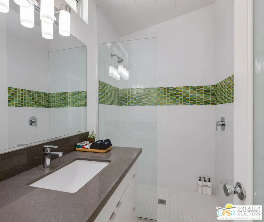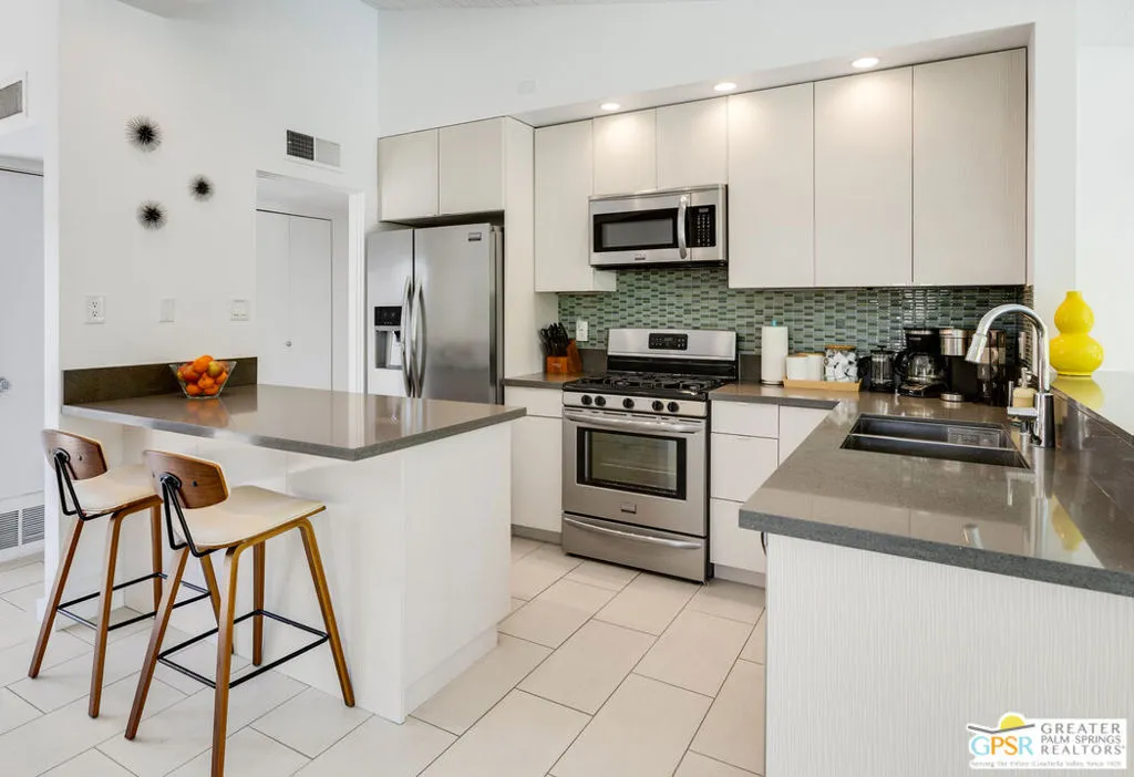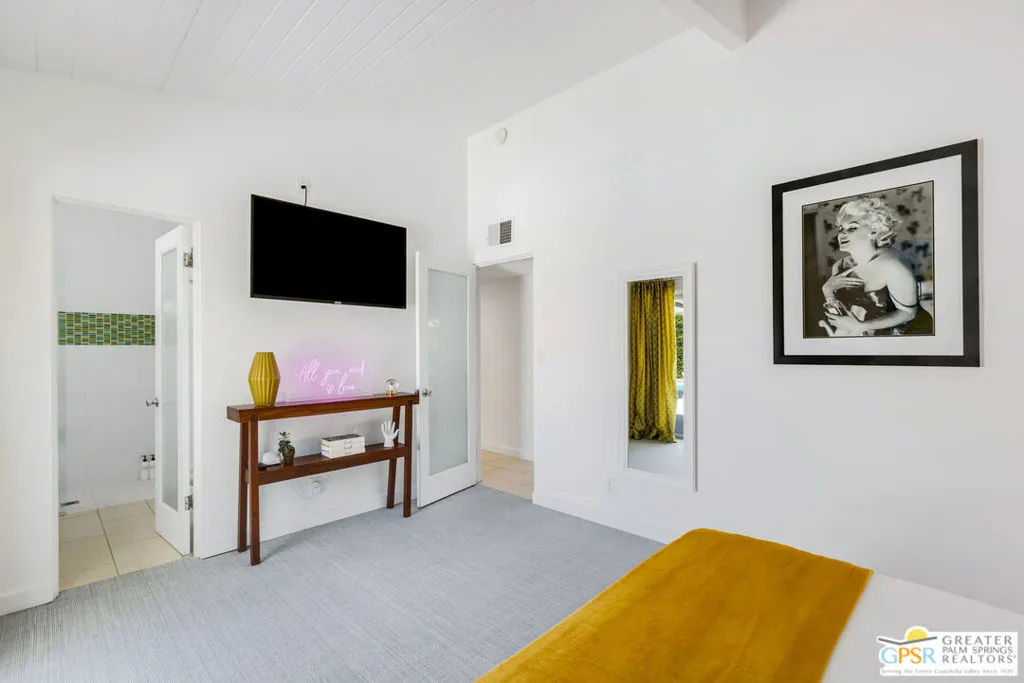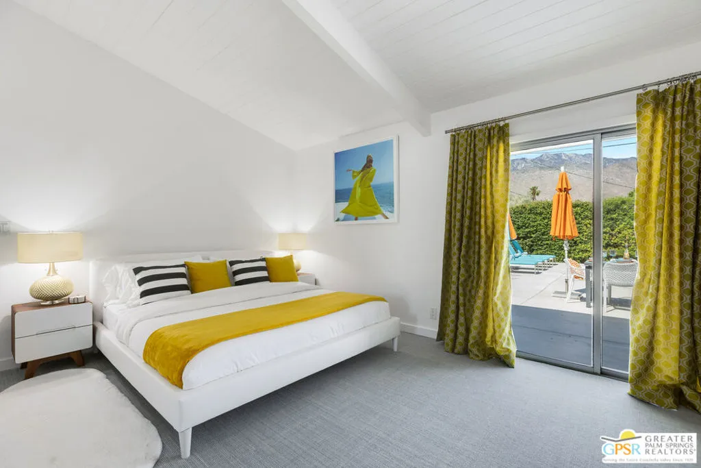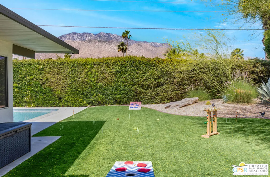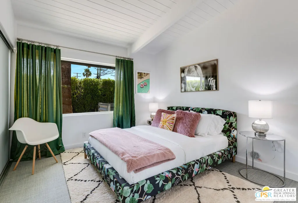 Mid-century modern Alexander home designed by Palmer & Krisel, located in Sunrise Park with stunning mountain views. Built in 1958, this iconic architectural style is known for its clean lines, vaulted tongue-and-groove ceilings, exposed beams, and signature brick fireplace. Privately gated with an automatic driveway gate and centrally located near downtown Palm Springs, the home offers flexibility as a full-time residence, second home, or investment property. The 3-bedroom, 2-bath layout features an expanded family room and dining area, creating generous living space filled with natural light. The remodeled kitchen connects directly to the main living areas, and sliding glass doors open to a west-facing patio and large pool with west facing mountain views. A heated spa, fire pit, and professionally landscaped front and rear yards create a true desert retreat. The primary suite has direct pool access, ample closet space, and a large walk-in closet. Both bathrooms have been updated. Major system upgrades within the past 1 to 3 years include a new air conditioning and heating system, pool pump, roof and solar panels, and a Level 2 EV charging station. A two-car garage provides extensive storage. The property has a successful 5-star VRBO history and strong short-term rental performance. While the City of Palm Springs enforces a neighborhood short-term rental cap, Sunrise Park has historically remained below that threshold. Buyers are advised to independently verify current permit availability with the City. Brand new furnishings are negotiable, with select exclusions. Due to frequent rentals, showings are by appointment only and limited to February 23 through February 28 (Saturday the 28th only available until 2pm).