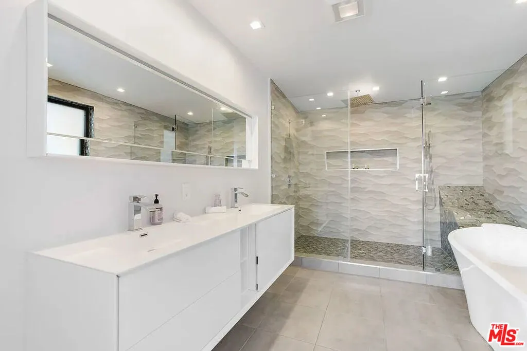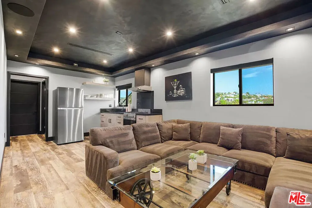 FULLY FURNISHED AND FULLY EQUIPPED, AVAILABLE FOR SHORT TERM RENTAL. Ultra-modern smart home is located in the lavish Hollywood Hills. From the wood & wrought iron accenting, to the brushed cement walkways, this dashing property radiates style & flare. The elegant entryway welcomes you into a bright & luxurious open floor plan. Your eyes can't help but be drawn to the stunning LA skyline, framed by the floor to ceiling window walls. Light hardwood flooring & frameless glass paneling, pair effortlessly with the chic white & charcoal furnishings. Coupled with liner fireplaces, backlit ceiling beams, and state of the art technology, this home is the peak of modern luxury. This property is integrated with a Control 4, smart-home system. Control the entertainment content, 35-speaker surround sound system, LED scene lighting, temperature, and security system, from anywhere in the world with your Control 4 application. With new stainless steel appliances, a chilled wine closet, ample counter space, and a large island, this bright & fresh kitchen. The downstairs bedroom with its own living room.