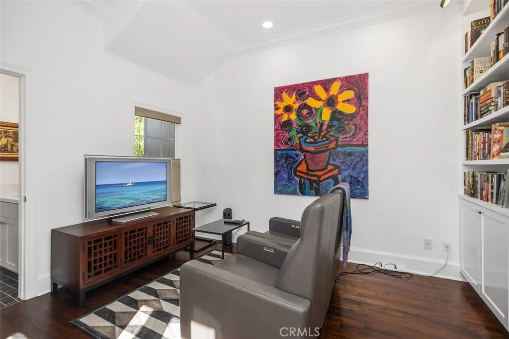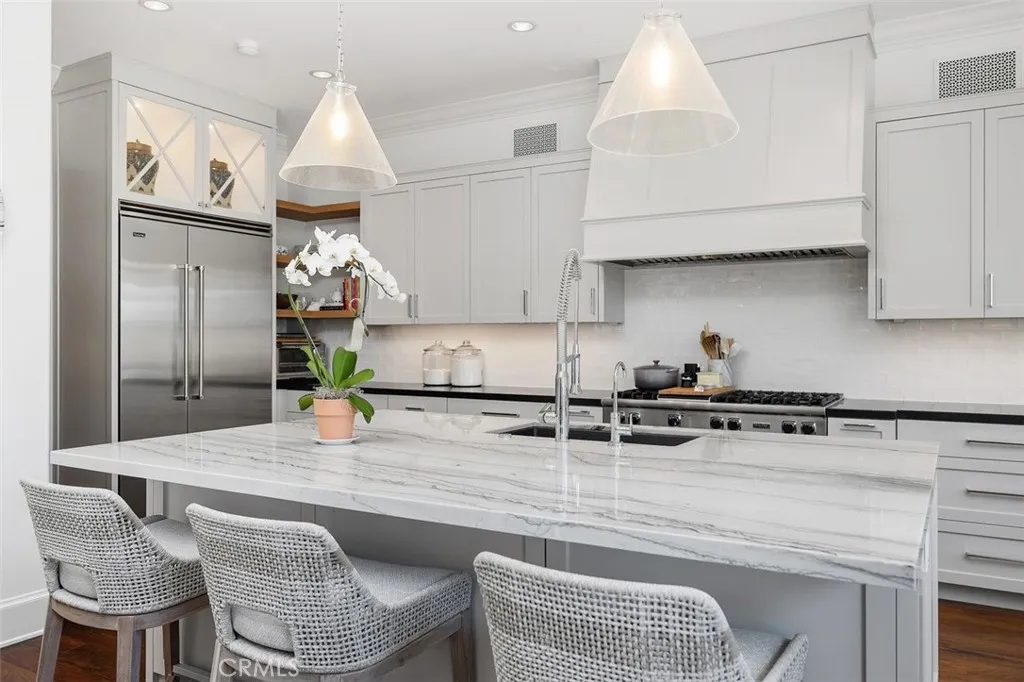 The family room features a second fireplace, custom built-in media cabinetry, expansive windows, and direct access to the backyard, creating effortless indoor-outdoor flow. The kitchen is anchored by custom cabinetry and Viking appliances and was thoughtfully redesigned with a center island, breakfast nook, and a butler’s pantry complete with additional counter space, pantry storage, and a wine refrigerator.