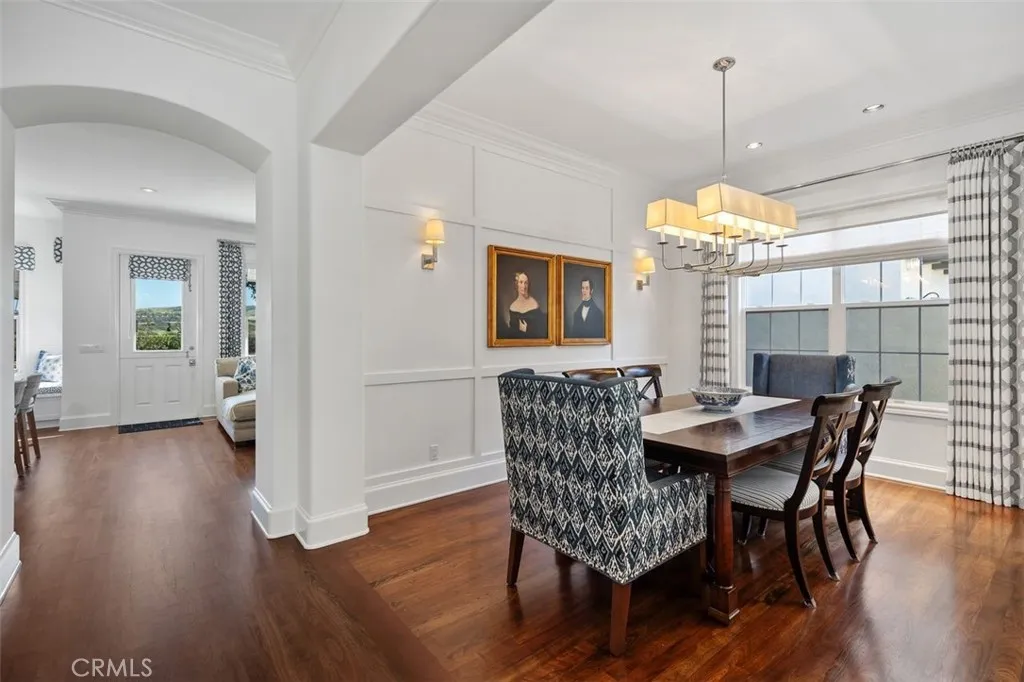 Just off the entry, the formal living room with fireplace flows seamlessly into the formal dining room, separated by a half wall that maintains both openness and definition. An arched hallway leads to the heart of the home, where an open-concept family room and extensively upgraded kitchen create a perfect setting for daily living and entertaining.