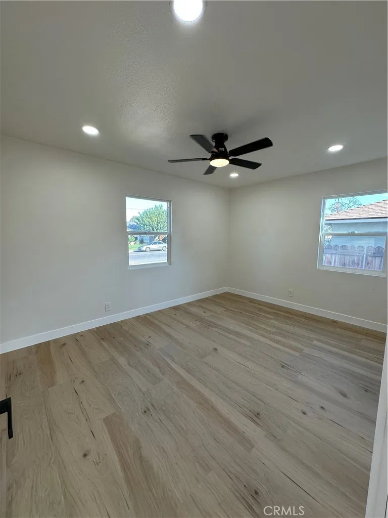 Stunning Remodeled single story home. This beautifully updated 2-bedroom, 1-bathroom residence features approximately 931 sq. ft. of modern living space, thoughtfully renovated inside and out. Step inside to a brand-new kitchen showcasing elegant quartz countertops, stylish cabinetry, and contemporary finishes. The bathroom has been tastefully upgraded with new tile shower walls and modern fixtures. Additional improvements include new flooring throughout, freshly re-plastered interior walls, new ceiling fans and lighting in every room, and fresh interior and exterior paint.