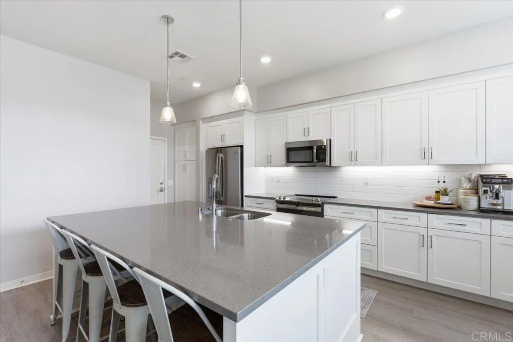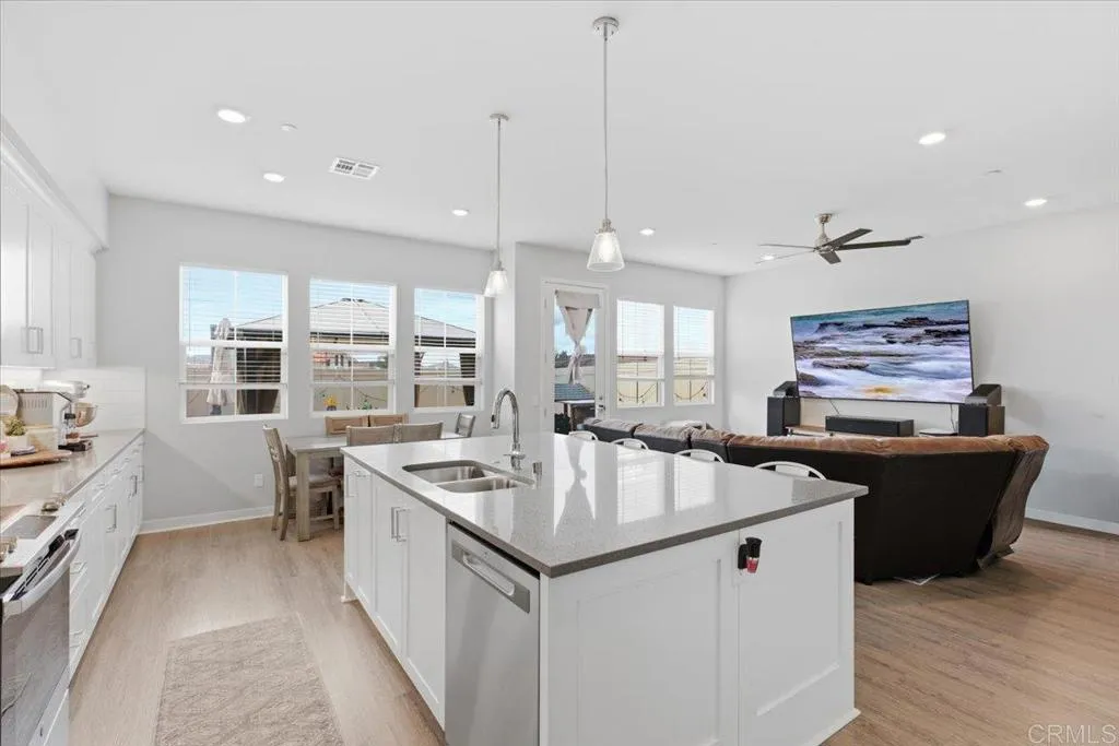 First resale opportunity in this newer construction El Cajon community. This move in ready 3 bedroom, 2.5 bathroom townhome offers modern finishes, energy efficiency, and a functional open floor plan in a highly convenient location. The main level features a bright open living space and a chef style kitchen with quartz countertops, stainless steel appliances, large refrigerator, and an oversized island that opens to the dining and living areas. Upstairs, the spacious primary suite includes two walk in closets and a spa style bathroom with dual vanities and a custom tile shower. Secondary bedrooms are generously sized with upstairs laundry for convenience. Additional highlights include paid off solar, an on demand hot water recirculation system for instant hot water, central AC, ceiling fans in every room, attached 2 car garage, and an oversized driveway. Private enclosed backyard is ready for your personal touch. Located close to shopping, Starbucks, restaurants, parks, schools, and easy freeway access to Highway 67, I 8, and 52. Short drive to beaches, Downtown San Diego, and military bases.