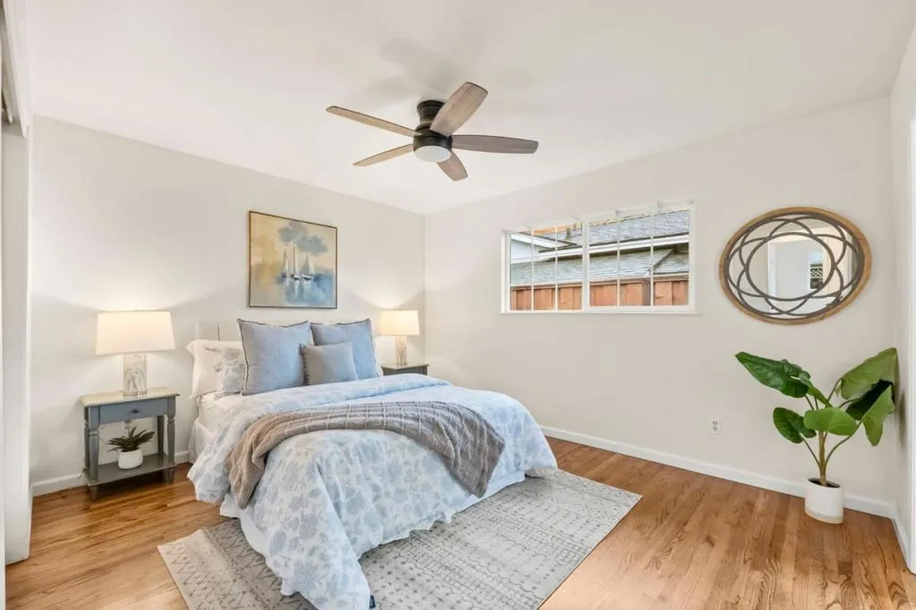 Located in the heart of the Blossom Valley neighborhood of South San Jose, this warm and welcoming, single-story home is a perfect place to start your next chapter. With a front Living Room facing the street and a wood-burning fireplace to warm Winter nights, you can watch the seasons pass by. On the other side of the home you will find an efficient kitchen with large pantry, newer appliances and another street-facing window. The kitchen opens nicely to the family room with both garage access and sliding glass doors to the backyard. Toward the back of the home is a seamless layout of four bedrooms and two baths, entry coat closet and hallway linen closet, for optimal organization. All living spaces have the timeless warmth of newly refinished, original hardwood flooring, complimented by a tiled entryway. The primary suite and hall baths are newly painted and offer an opportunity to put modern touches once you move in. The fenced in backyard has space for dining, a firepit, gardening, outdoor games and entertainment. Swing on the classic, timeless tree swing, or tinker in the hobby shed. As a community, Blossom Valley is known for its quiet residential feel and excellent convenience. Residents enjoy parks and green spaces, shopping, dining, and everyday essentials.