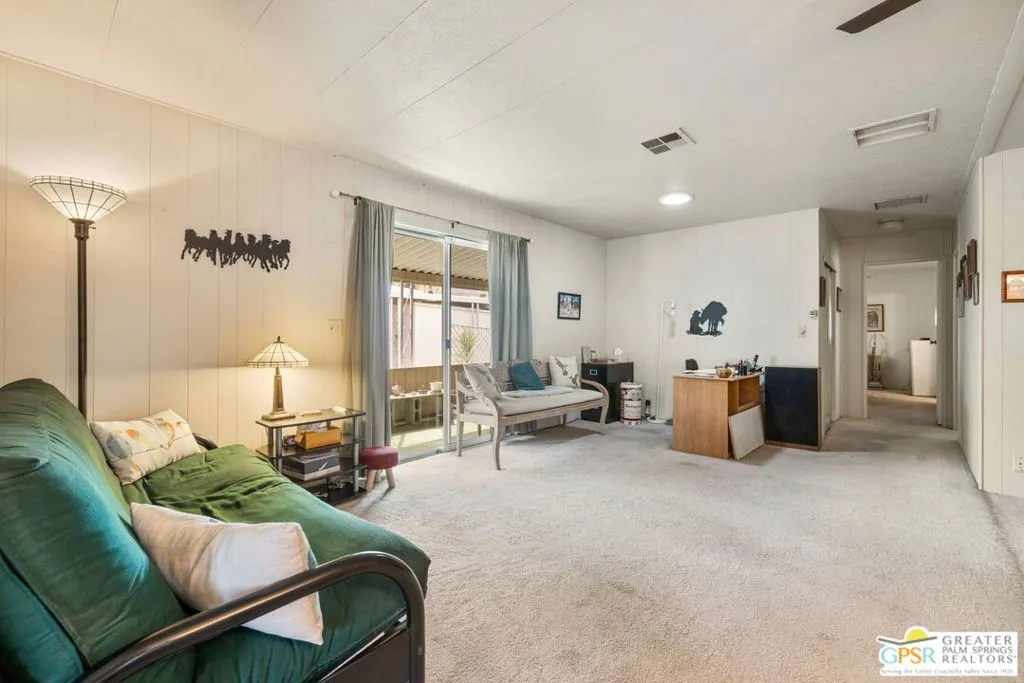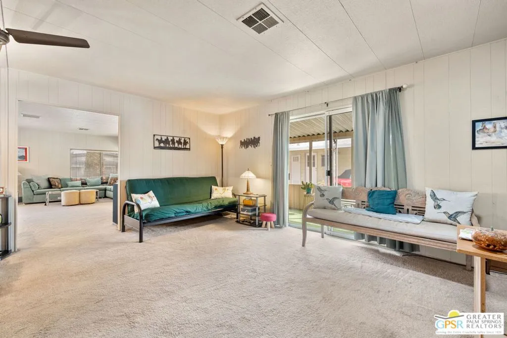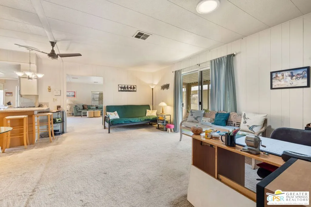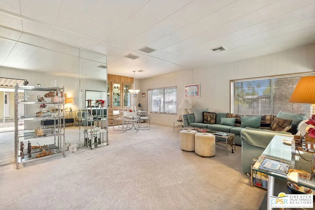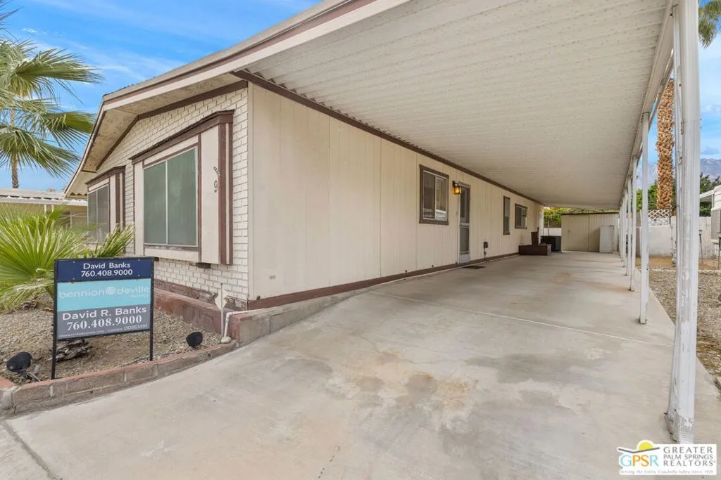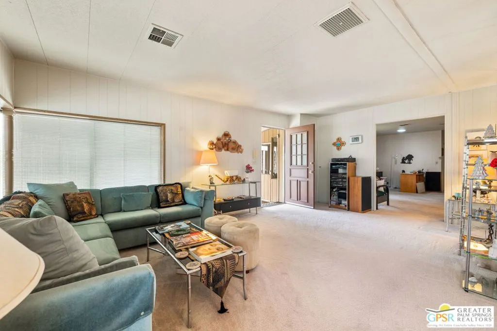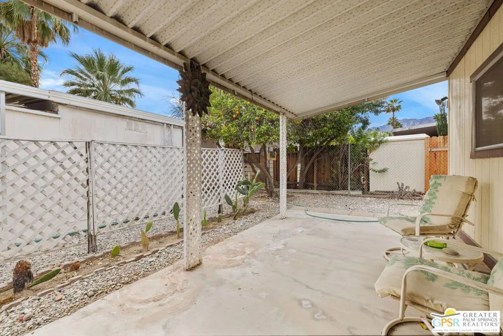 Welcome to your dream Palm Springs lifestyle in this charming manufactured home nestled in the highly desirable Palm Springs View Estates. This spacious 2-bedroom, 2-bathroom manufactured double-wide home in Palm Springs View Estates is seeking its next owner. This home offers the option to keep it as is or transform it into your own. Palm Springs View Estates is a 55+ community that boasts community pools and spas. There's also covered carport parking for at least two cars, and the primary suite features a spacious ensuite bathroom. Welcome to your new home! The 2-bedroom, 2-bathroom home has a spacious interior of 1440 square feet. It's conveniently located near stores, restaurants, two public 18-hole Arnold Palmer-designed golf courses, and minutes away from Agua Caliente Casino. Move-in conditions include furnishings and a spacious storage shed.The open floor plan features am additional versatile Screened Den/California Room, perfect for enjoying the cooler seasons in comfort and style.Affordable living under rent control with space rent at approximately $714 per month, including water, sewer, and trash, makes this a great value for this prime location. (Park requires income of 3x space rent and park approval prior to closing.)The community amenities are abundant, including three sparkling pools and spas, walking trails, and a clubhouse featuring a gym, billiards, ping pong, a community kitchen, and a cozy TV lounge.However, please note that per community rules (CC&Rs), a second resident may be 45+. Owner-occupants only, with no rentals, to preserve the peaceful and neighborly environment. Click on Video Tour for walk through - Additional photos coming soon -