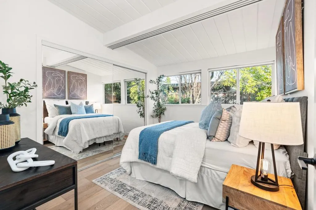 Tucked within the quiet Circles of Palo Altos Fairmeadow neighborhood, this thoughtfully refreshed home offers a refined take on mid-century living, where light, simplicity, & indooroutdoor connection define the experience. Expansive windows, skylights, and a private central courtyard fill the home with natural light, creating an airy and serene atmosphere throughout. The open-concept living, dining, & kitchen areas flow seamlessly, ideal for everyday living and relaxed entertaining. Clean architectural lines, exposed beams, & newly installed white oak floors provide a timeless, cohesive backdrop. The remodeled kitchen blends form and function with sleek white cabinetry, a breakfast bar, stainless steel appliances, & honed gray countertops. Large glass sliders extend the living spaces outdoors to private side and rear yards featuring a spacious shaded patio and drought-tolerant landscaping framed by mature trees. Bedrooms are comfortably scaled and quietly situated, while the updated bathrooms reflect a fresh, contemporary aesthetic. A covered carport with an attached storage room. Conveniently located near major commute routes, Caltrain, Stanford, and leading tech campuses, and served by acclaimed Palo Alto schools.
