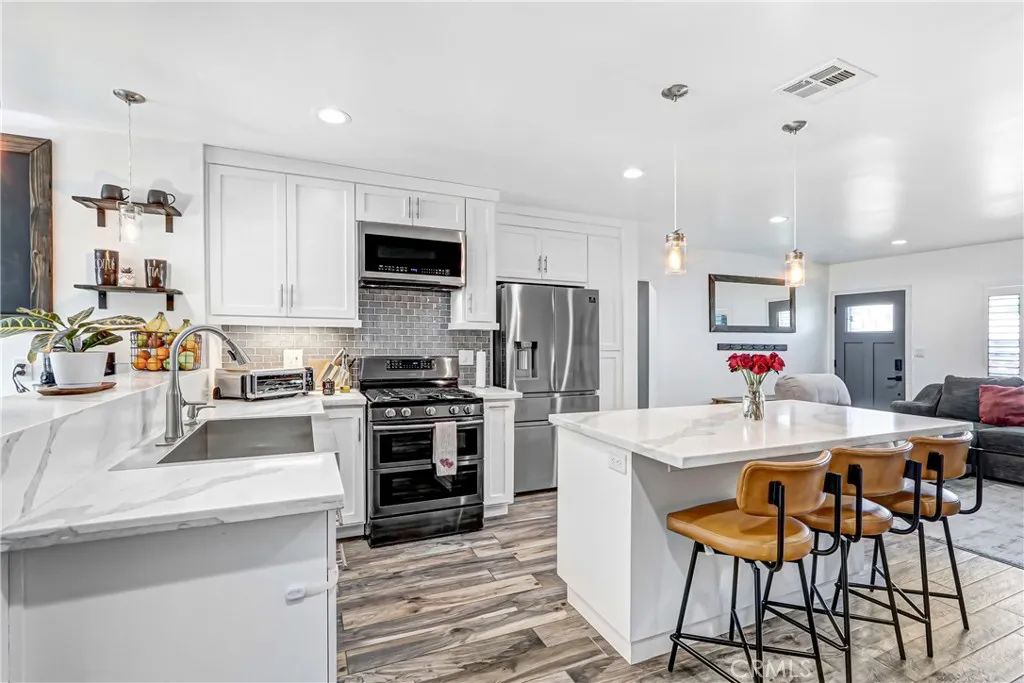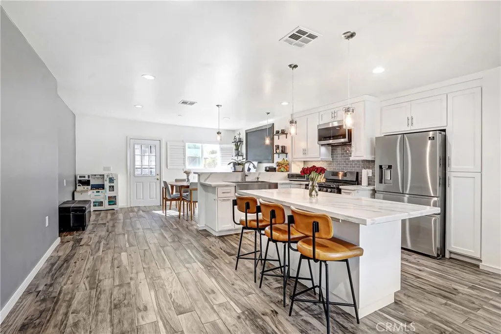 Step inside to an airy, open-concept great room where wide-plank, wood-look flooring runs throughout and natural light pours in through plantation shutters. The kitchen is the true centerpiece: white shaker cabinetry, stainless steel appliances, a generous farmhouse sink, designer pendants, and a show-stopping oversized island topped in a marble-inspired finish—perfect for breakfast, homework, and effortless entertaining. Just beyond, a built-in buffet/desk area adds everyday function, whether you’re working from home or hosting friends.