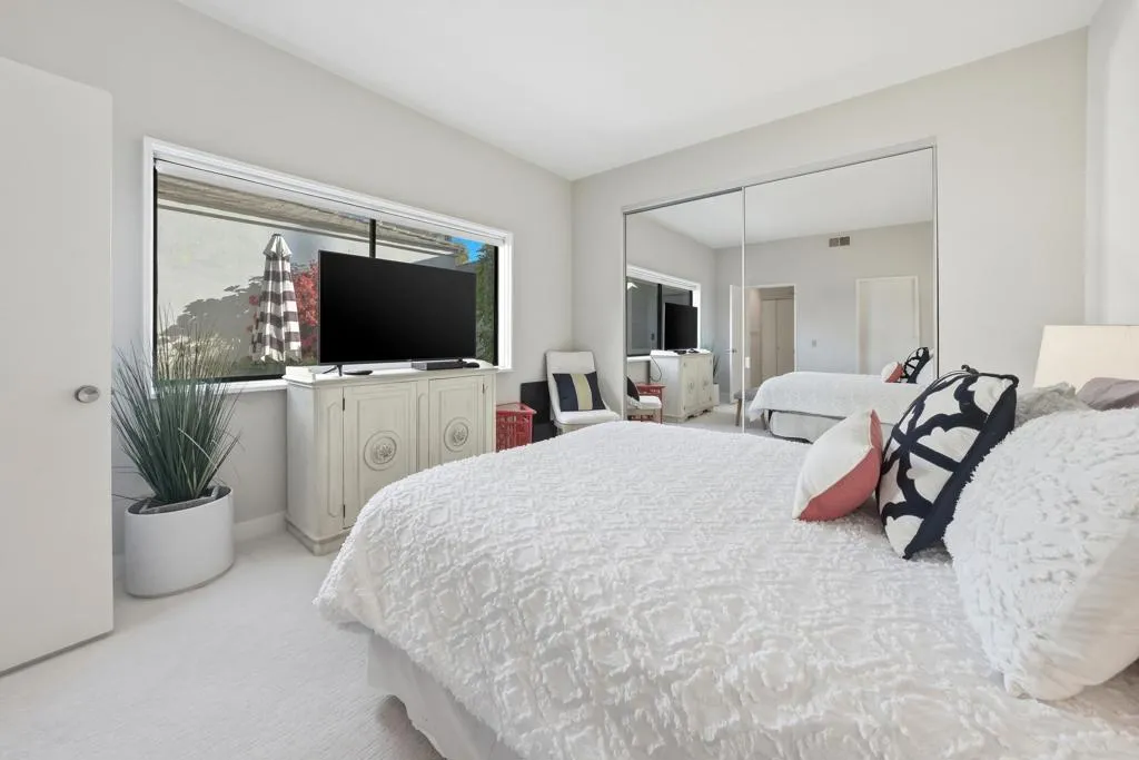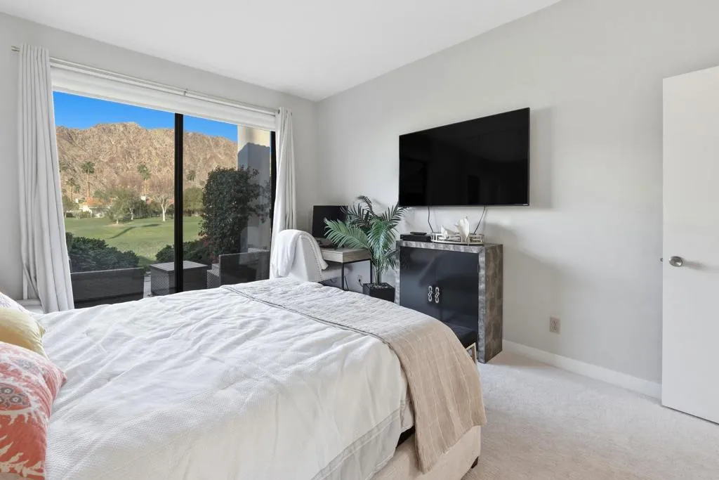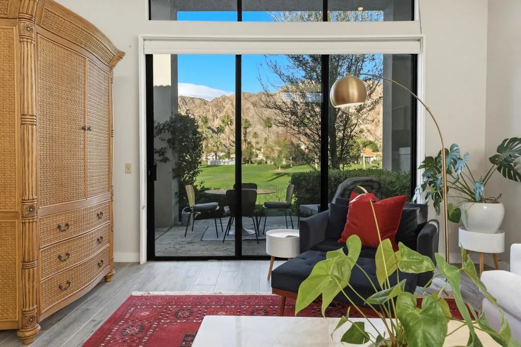 One of the best views in all of PGA West! Two bedroom, two bath, approx. 1,330 sq. ft. Sophisticated casual home with stunning design. Features lovely courtyard entry, living and dining great room space with high ceilings and windows that bring in the desert's natural sunlight. Spacious kitchen with new stainless appliances and new granite countertops. Large primary suite with double vanity bath and great views, plus another inviting guest room with ensuite bathroom access. The many perfect upgrades include new designer paint, porcelain tile plank flooring, high grade carpeting, and designer Hunter Douglas blinds. Enjoy dining on the back patio on the highly desired tee box of the eighth hole on the Palmer Private Course. Ideal location with gorgeous mountain and golf course views for breathtaking sunrises and sunsets. Offered partially furnished per inventory.