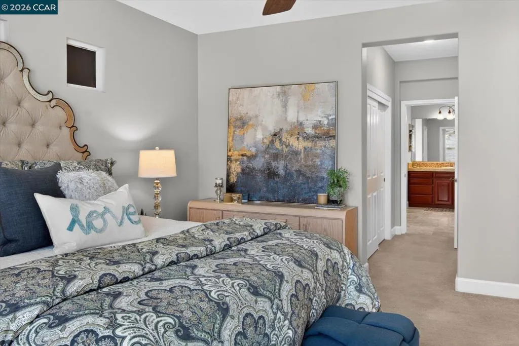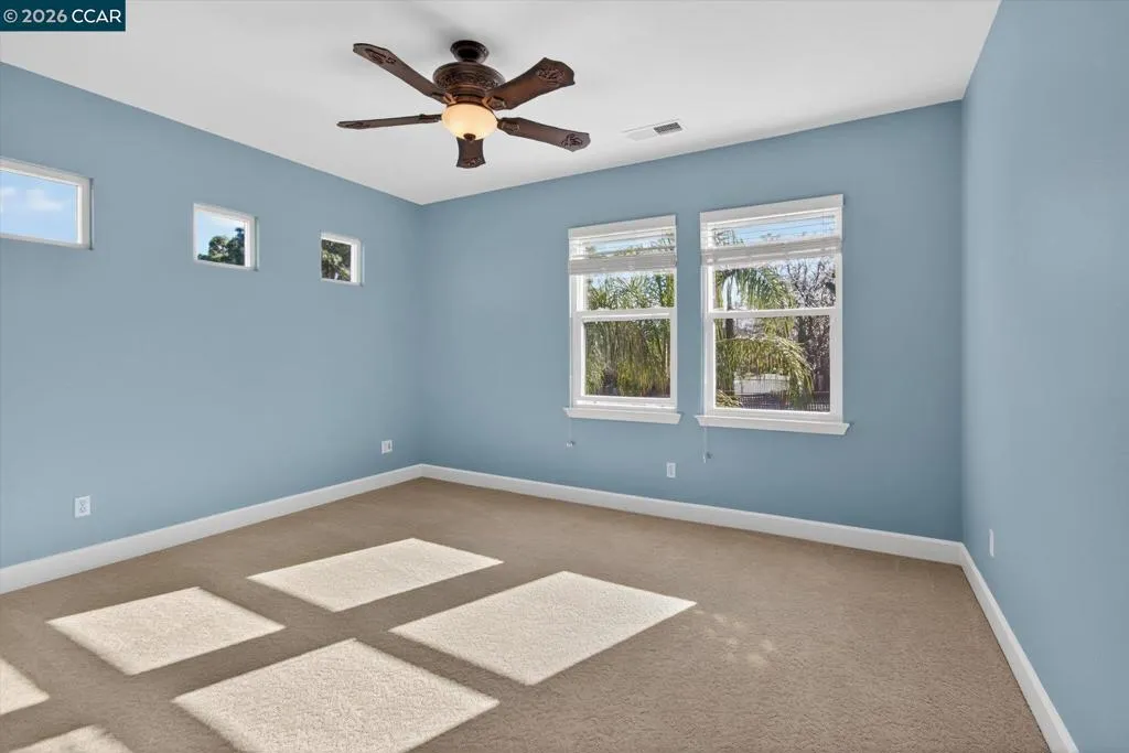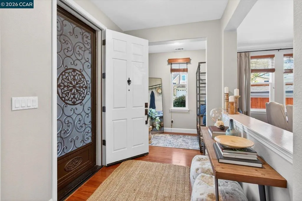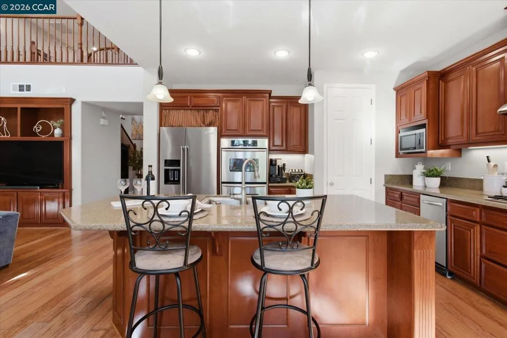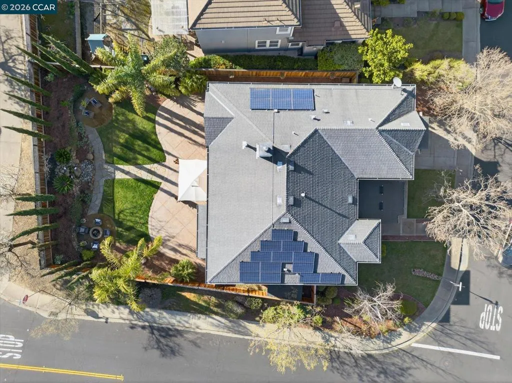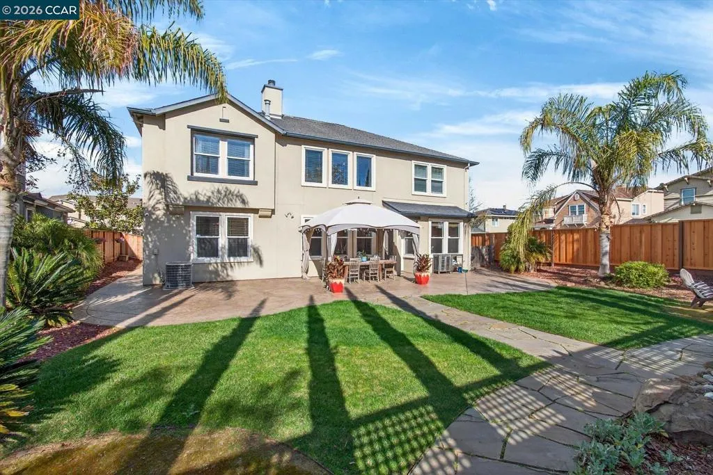 Welcome to this exceptional home in Benicia’s highly desirable Waters End neighborhood, offering an ideal blend of space, comfort, and elevated design. With 5 bedrooms and 3 full baths, including a convenient downstairs bedroom and full bathroom, this thoughtfully planned layout is perfect for guests, multigenerational living, or a private home office. Spanning 3,485 sq ft on an expansive .22-acre lot, the home impresses with soaring 18.5-foot ceilings in the great room and 10-foot ceilings throughout. Enjoy multiple living spaces including a formal living room, a dedicated media room, and an open kitchen/family room combo. The chef’s kitchen features a large island/breakfast bar, KitchenAid stainless steel appliances, double oven, gas cooktop, walk-in pantry, and abundant cabinet space. Unwind in the spacious primary suite with a cozy gas fireplace, dual walk-in closets, and a spa-inspired bathroom retreat featuring a jetted soaking tub, double vanity, and separate walk-in shower. Step outside to your private backyard oasis with a wood-burning fire pit, cascading waterfall feature, stamped concrete patio, and an illuminated pergola—perfect for entertaining, outdoor dining or a quiet romantic evening. A three-car tandem garage, with home gym completes this turnkey masterpiece.