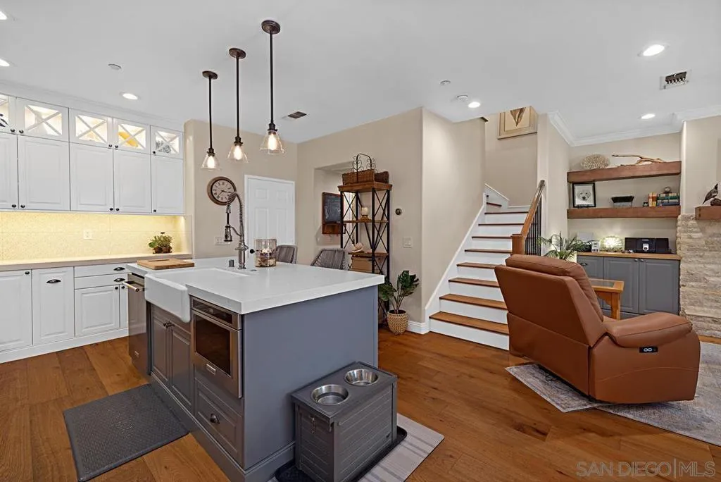 Experience the ultimate in luxury and style encompassing this extensively redesigned and renovated residence in the beautiful gated Bungalows at Escala community. This rarely available 3 bedroom, 2.5 bathroom floorplan, the largest of the Bungalows units, has been crafted to create a more functional and open living space with fine attention to details. This unit lives like a single-family home, offering privacy and serenity while located in the center of San Diego, only minutes to just about everything. Enjoy gardening or relaxing in your private, gated backyard with no homes behind you, surrounded by mature landscaping and peaceful panoramic hillside views. Interior highlights include a new custom kitchen with an oversized island, high-end KitchenAid appliances, quartz countertops, a built-in under counter microwave oven drawer, under cabinet lighting, and lighted soft-close drawers. A large walk-in pantry with finished under stair area provides ample storage. The new full sized LG washer and dryer with a butcher block folding counter offer additional convenience. Stunning wide-plank, French Oak flooring meticulously installed throughout the home, with custom built wood stairs and stair railings. A new oversized fireplace, faced in rustic limestone with wood shelves and a stately mantle, invites warmth. The spacious primary bedroom features an exquisite new bathroom with a large walk-in tiled shower and a freestanding soaking tub. All interior walls and ceilings are hand troweled. New dimmable lighting and ceiling fans. 3rd bedroom is showcased as a lighted walk-in closet.