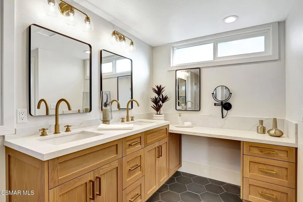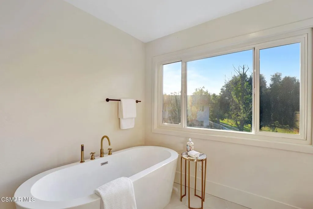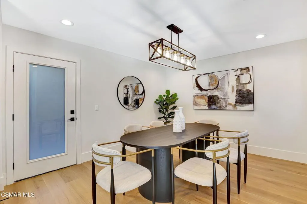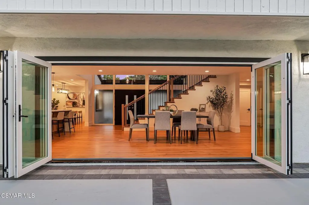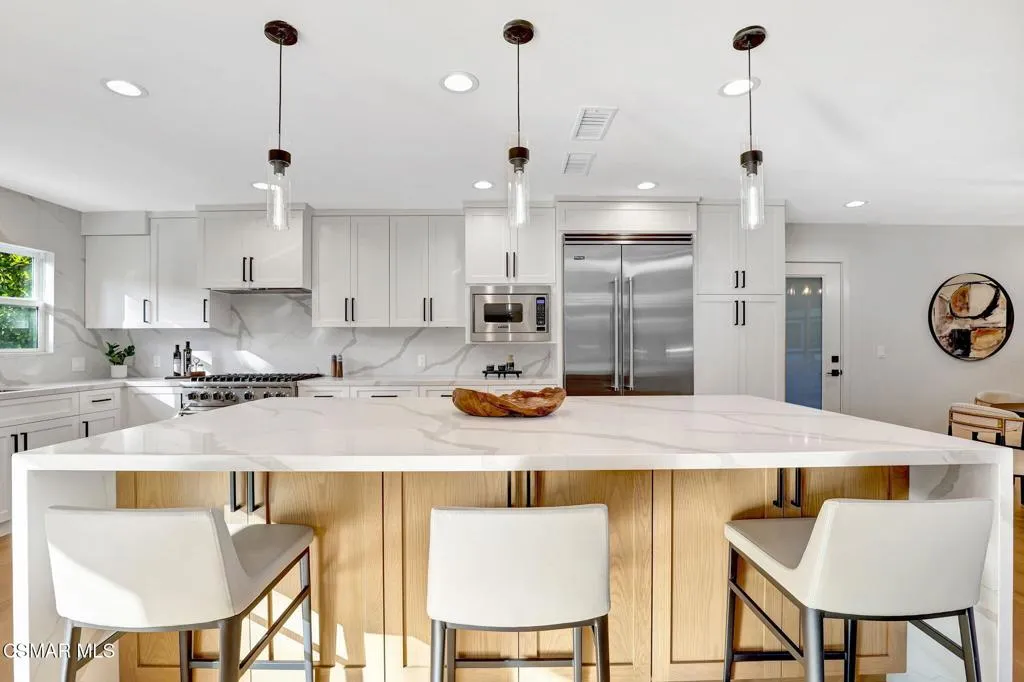 Step into this gorgeous, completely remodeled modern masterpiece located in the heart of Foxmoor, one of Westlake Village's most coveted neighborhoods. Situated on a peaceful cul-de-sac RIGHT NEXT to the greenbelt, this home has been fully upgraded from top to bottom with a fresh modern aesthetic and recreated to illustrate the California lifestyle, with seamless indoor-outdoor living and entertaining at its absolute best! As you approach, you are welcomed by the BRAND NEW charcoal paver driveway and walkway with lush green landscaping. The flooring in this home is European white oak engineered wood with wide 9'' planks and NEW custom cabinetry all throughout. The expansive entryway reveals soaring ceilings, a beautiful modern gold light chandelier, marvelous white oak staircase and a new open concept design. The exquisite designer kitchen is a chef's dream, boasting Vadara quartz countertops, high-end Viking appliances, and a massive island with waterfall edges. Harmonious indoor-outdoor entertaining awaits with spacious living and dining areas that open through bifold doors to a beautifully landscaped backyard. Completing the first floor is a full bath with a newly added standing shower, office and laundry room, leading into the finished garage with crisp epoxy floors. Upstairs you will love the spacious primary suite, plus three bedrooms, and secondary bathroom. The primary suite is equipped with vaulted ceilings, 2 large closets, a newly expanded and reimagined spa-like primary bathroom with a huge walk-in shower, double vanity and make-up station. Enjoy peace of mind with fully permitted upgrades to the electrical, plumbing, and HVAC systems. This home is just steps away from award-winning Westlake Elementary, with wonderful shopping and restaurants close by. Experience luxury living where no expense was spared. Welcome to your new home!