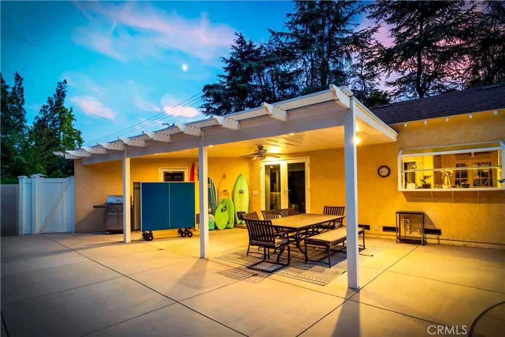 Outdoors, the grounds feel like a private retreat. Designed with tranquility in mind, the yard includes multiple seating areas, a pool with an illuminated water feature, and a covered patio suited for outdoor dining and gatherings. Garden enthusiasts will appreciate the irrigated raised planting beds with drip systems, a small orchard, and a variety of mature fruit trees.