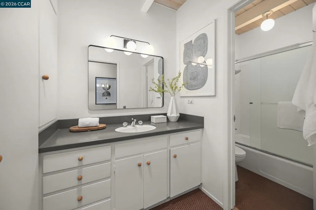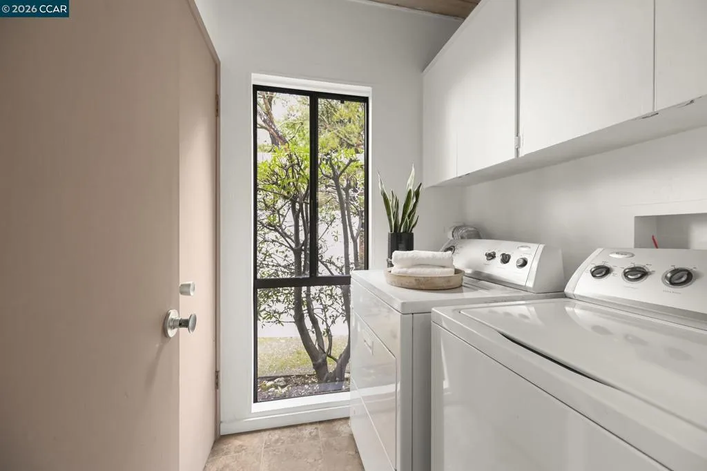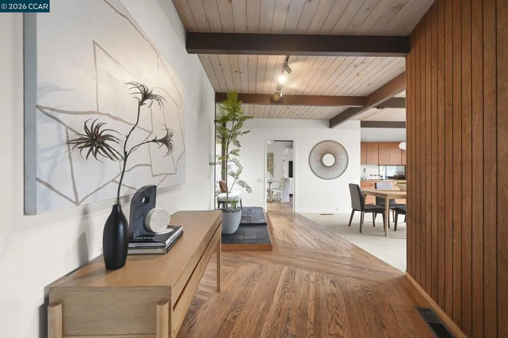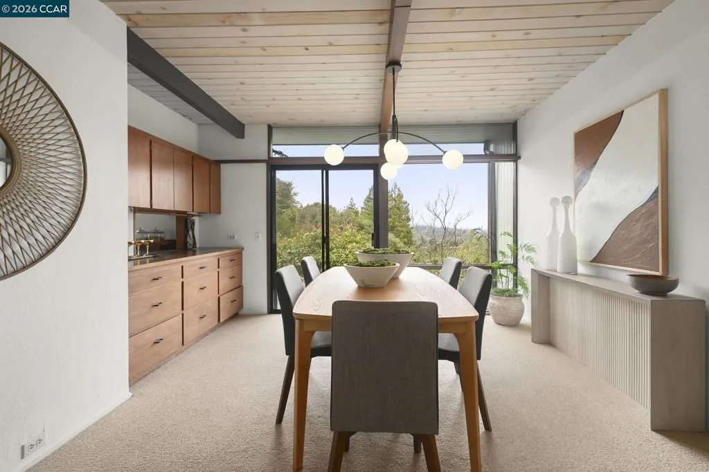 Welcome to 92 Evergreen Dr, a classic mid-century modern nestled in the hills of Orinda. Tucked up a semi-private drive, the home captures that iconic mid-century vibe from the moment you arrive. A formal living room & dining room showcase expansive picture windows framing incredible views of rolling hills & mature trees. The original yet beautifully maintained eat-in kitchen offers both charm & functionality, featuring a convenient pass-through to the dining room that makes entertaining effortless. A sliding glass door opens directly to the back patio, blending indoor comfort w/ outdoor living, perfect for morning coffee, summer barbecues, or relaxed evening gatherings. Down the hallway, you’ll find a hall bath & 2 spacious bedrooms, including the primary suite w/ an attached bath & bonus room/office. Built as a 3 bedroom, the owners took down a wall to create 1 large room – can easily go back to make it a 3 bedroom. Original mid-century charm shines, complemented by thoughtfully updated lighting that stays true to the home’s design. A wraparound deck offers the perfect place to soak in the views, while the secluded back patio surrounded by mature trees creates a peaceful, private retreat. A must see & ready for new owners to make it their own amazing mid-century masterpiece.