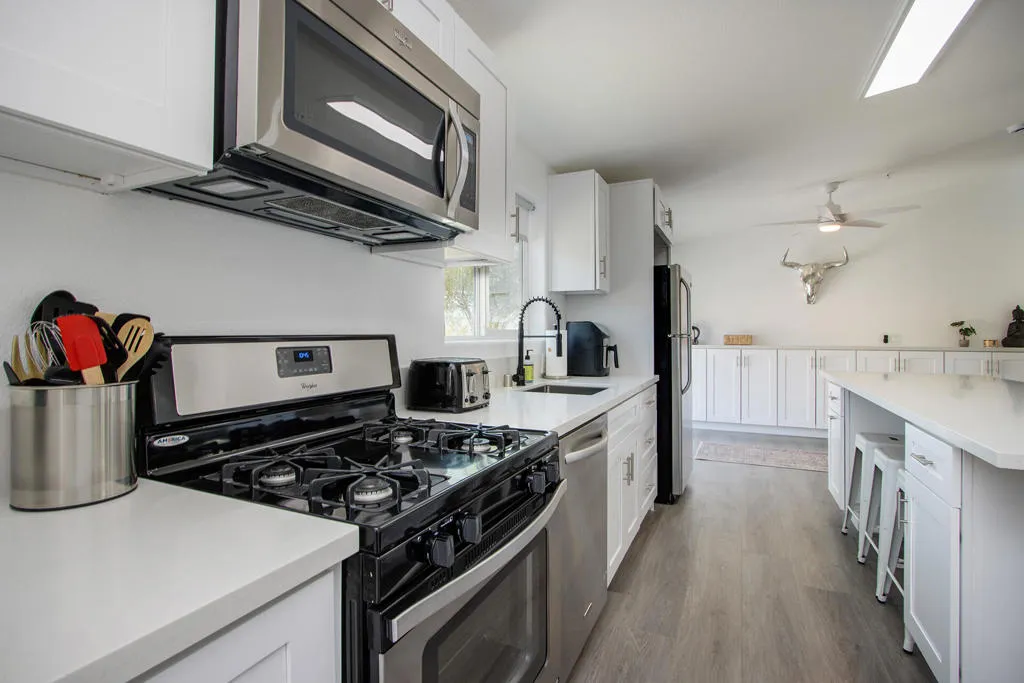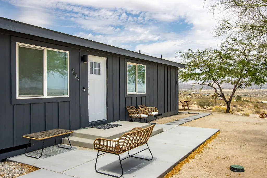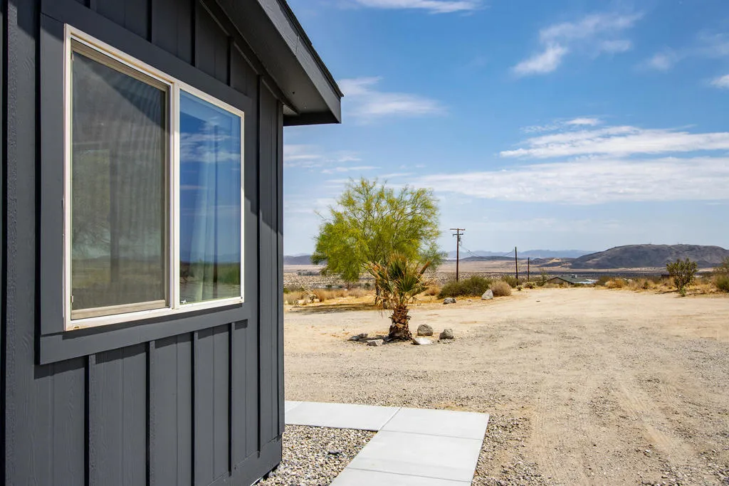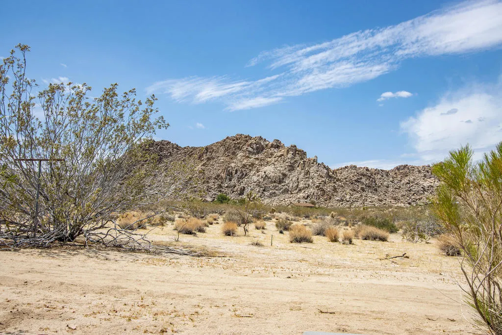 Designer remodeled home with skyline views! Set on 5+ acres of hillside in the highly desirable Panorama Heights neighborhood. Turn-key 3 bed 3 bath plus a large den that could be used as a 3rd bedroom with over 1,500sf. Pebble stone driveway with ample parking leads to the wraparound concrete patio and walkway to the front door. Living room with new floors, high sloped ceiling, recessed lighting, and gallery wall. Kitchen with new appliances, two breakfast bars with one as an island countertop. Stainless steel refrigerator, microwave, oven and cooktop, Abundant space with new cupboards and long counter tops. Additional dining area with built in cabinetry and glass sliders to the rear patio. Laundry room with double stack washer and dryer and butcher block counter. Large master bedroom with walk-in closet. Master bathroom with marble and glass shower. Guest bedroom with private bath. Backyard concrete patio enjoys picnic tables to enjoy dining alfresco with friends under the stars. STR permit approved. Inspiring views of the boulder studded mountains in the Joshua Tree National Monument. Captivating vistas for miles. Copper Mtn, Bunker Mtn, Mt Bartlette, the Bullion Mtns, and Mt San Gorgonio with snow capped peaks. Beautiful sunsets and shimmering city lights at night. Horse property. Less than 1000ft to the JTNM trails with gorgeous boulder gardens and canyons. Modern architectural new homes can be seen throughout the neighborhood. The high land value in Panorama Heights makes for sound investing. The county may allow for building another home and guest homes on this lot to expand your luxury compound. Short trip to organic restaurants, cafes, bars and boutiques in the JT Village. Close to the JTNM main gate where about 3 million tourists visit the park annually. 55 minutes to Palm Springs. Call for a showing today. (Tiny home on wheels & furniture is not included in the sale) Has 433a